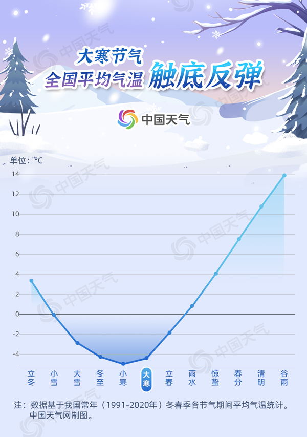 中國天氣網(wǎng)盤點1991年至2020年節(jié)氣大數(shù)據(jù)發(fā)現(xiàn),在小寒期間,全國平均氣溫跌到全年最低,僅有-5.1℃。而到了大寒節(jié)氣,氣溫開啟反彈之旅,比小寒上升0.6℃,達(dá)到-4.5℃。從全國平均氣溫而言,我國在小寒節(jié)氣達(dá)到最冷,大寒節(jié)氣雖然依舊天寒地凍、萬物蟄藏,但氣溫觸底反彈、生機潛伏,春天的腳步越來越近了。