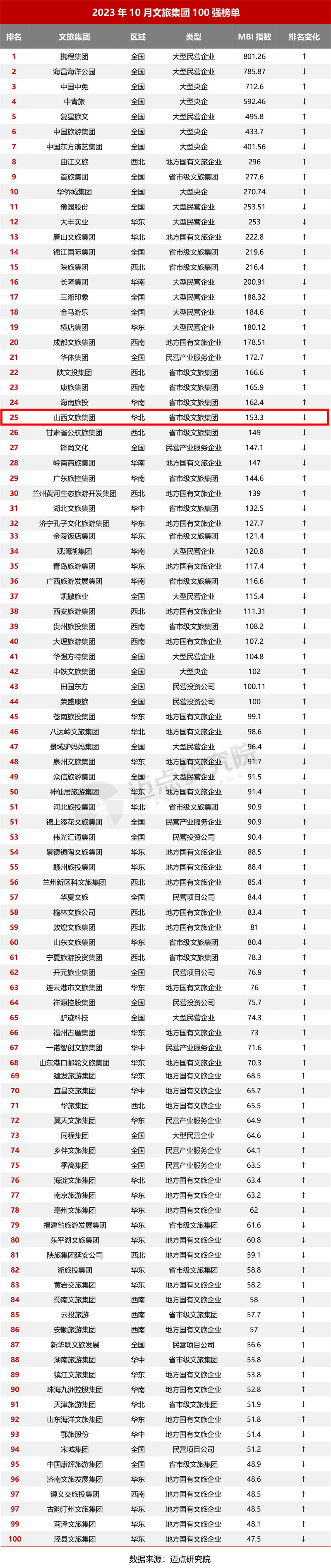 近日,“2023年10月文旅集團全國100強榜單”出爐,山西文旅集團榜上有名,居第25位。