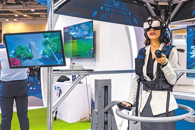 第二十一屆中國(蘇州)電子信息博覽會日前在蘇州工業(yè)園區(qū)舉辦。圖為觀眾在博覽會上體驗5G+元宇宙游戲。張 鋒攝(人民視覺)