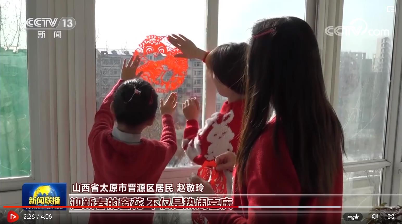 “在山西太原,‘五福臨門(mén)’‘玉兔迎春’等主題豐富的窗花,讓節(jié)日氣氛越發(fā)濃厚。”《新聞聯(lián)播》在《張燈結(jié)彩慶新春 喜慶祥和中國(guó)年》報(bào)道中,展示了太原市民剪窗花迎新春的喜悅。晉源區(qū)居民趙敬玲說(shuō):“迎新春的窗花,不僅僅是熱鬧喜慶,也寄托了我們對(duì)新春的祝愿。”