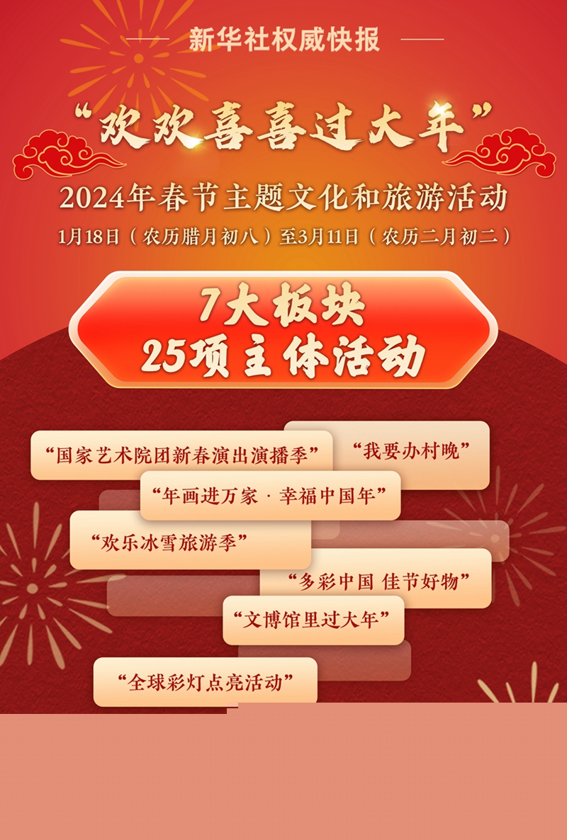 1月18日,文化和旅游部舉行媒體推介會,發(fā)布“歡歡喜喜過大年”2024年春節(jié)主題文化和旅游活動?;顒佑?月18日(農(nóng)歷臘月初八)至3月11日(農(nóng)歷二月初二)開展,包含7大板塊共計25項主體活動。