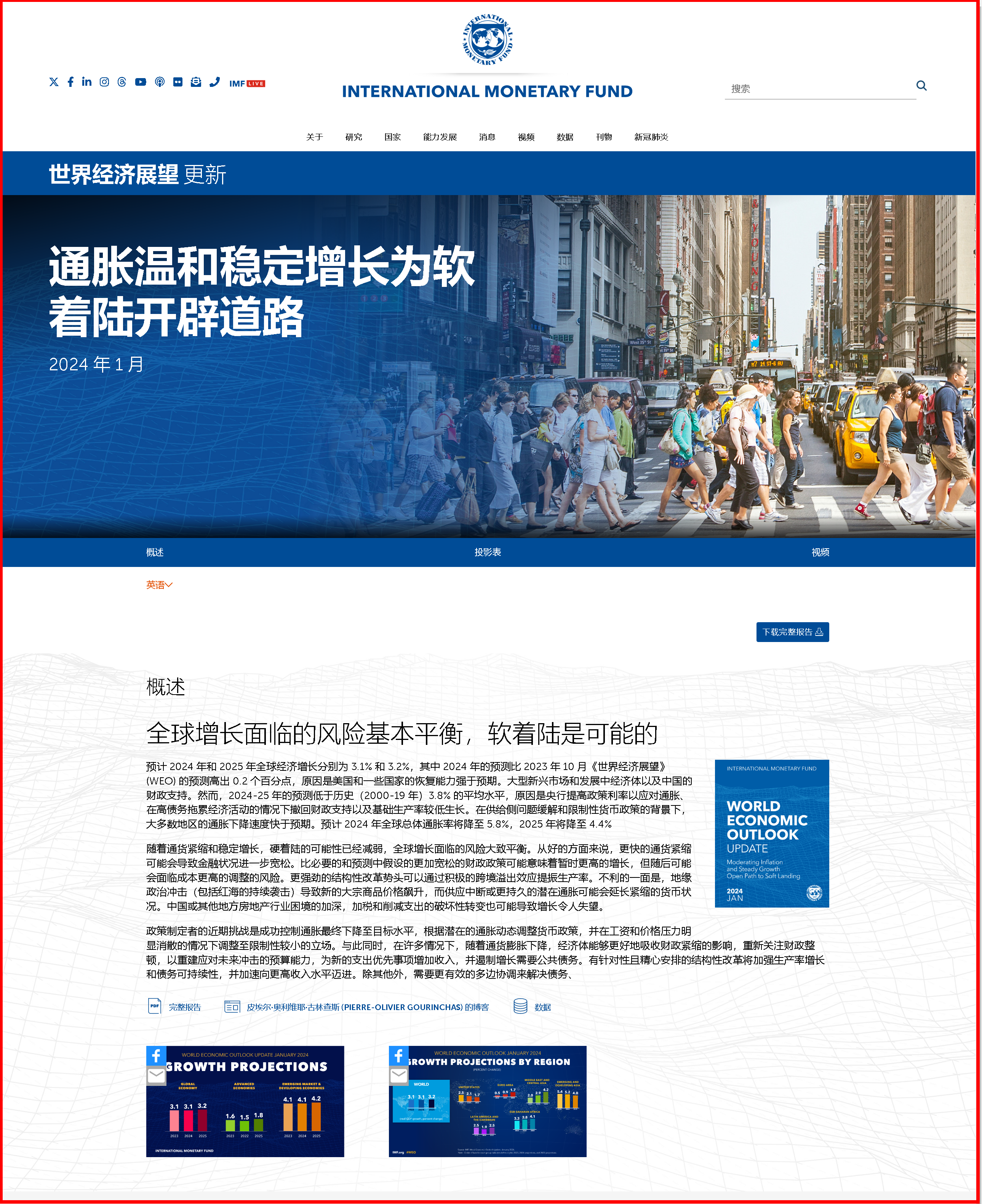 新華社快訊:國際貨幣基金組織(IMF)30日發(fā)布《世界經(jīng)濟展望報告》更新內(nèi)容,將2024年全球經(jīng)濟增長預期上調(diào)至3.1%,較去年10月預測值高出0.2個百分點。(記者熊茂伶)