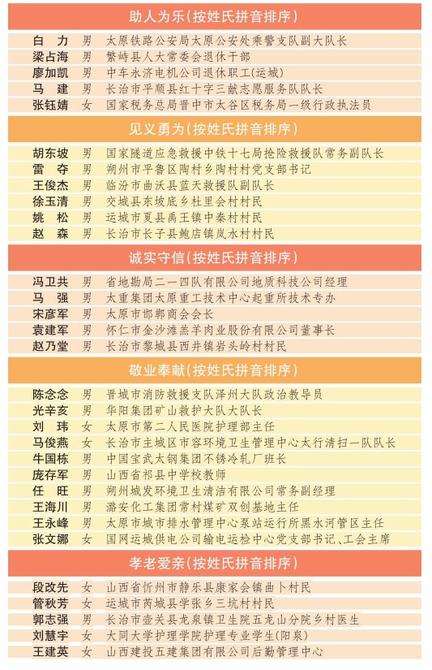 本次活動評選出山西助人為樂好人、山西見義勇為好人、山西誠實守信好人、山西敬業(yè)奉獻好人、山西孝老愛親好人共31人。(李煉)