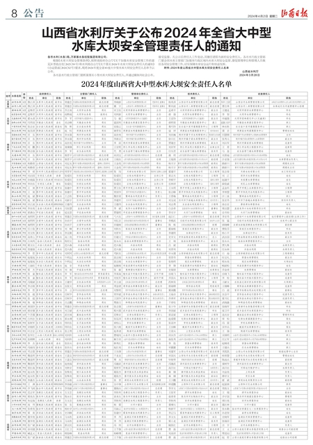 根據(jù)《水庫(kù)大壩安全管理?xiàng)l例》,按照省政府辦公廳《關(guān)于加強(qiáng)水庫(kù)安全管理工作的意見》(晉政辦發(fā)〔2023〕59號(hào))和水利部辦公廳《關(guān)于落實(shí)2024年水庫(kù)大壩安全責(zé)任人的通知》(辦運(yùn)管函〔2024〕52號(hào))要求,現(xiàn)將2024年度全省83座大中型水庫(kù)大壩安全責(zé)任人名單予以公布。