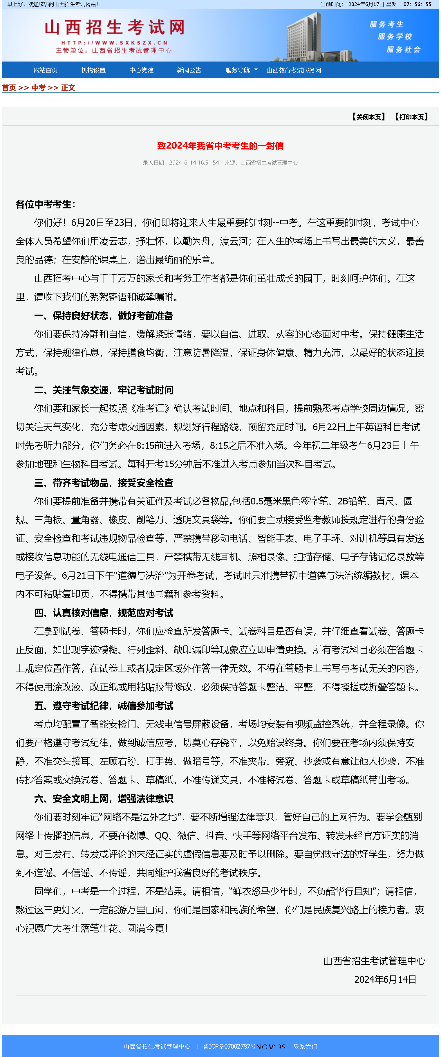 黃河新聞網(wǎng)訊(記者周昱麗)6月14日,山西省招考中心發(fā)布《致2024年我省中考考生的一封信》。節(jié)選如下: