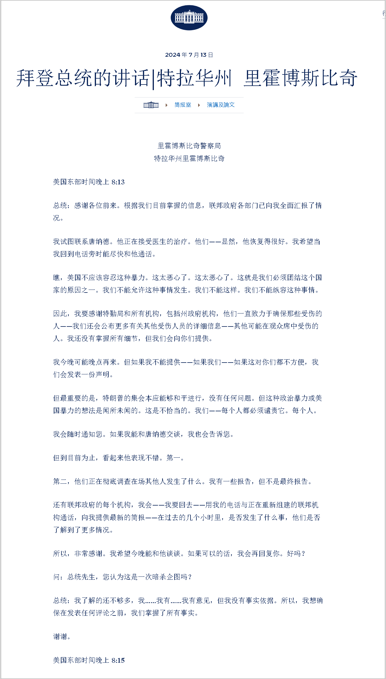 “吉爾和我感謝特勤人員把他(特朗普)帶到了安全的地方。在美國,這種暴力沒有立足之地。我們必須團(tuán)結(jié)起來,作為一個(gè)國家來譴責(zé)它?!?/span>