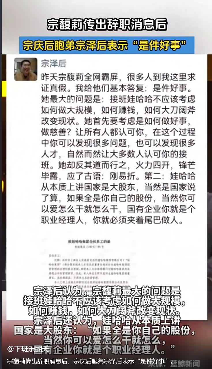 這或許一定程度上解釋了,宗慶后胞弟宗澤后為何會(huì)在朋友圈公開表示,宗馥莉辭職“是件好事”。