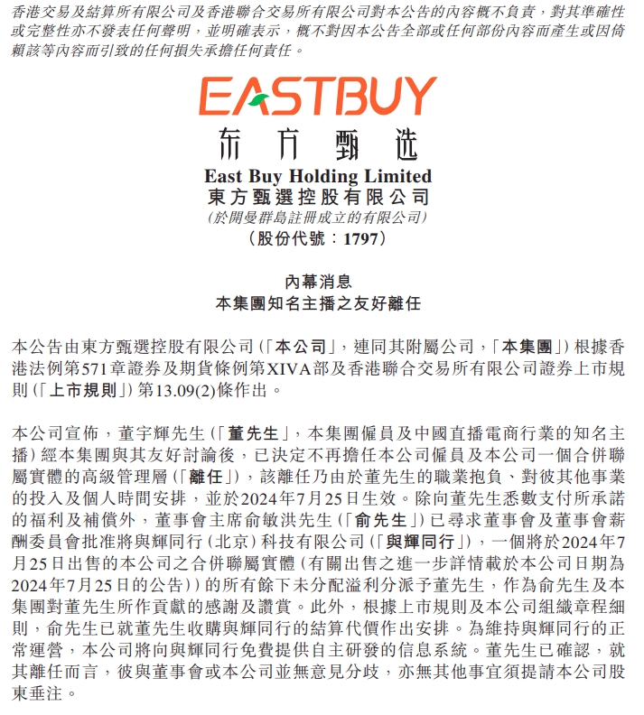 天天消費(fèi)訊,7月25日,東方甄選在港交所公告,董宇輝已決定不再擔(dān)任公司雇員及公司一個合并聯(lián)屬實(shí)體的高級管理層,該離任乃由于董宇輝的職業(yè)抱負(fù)、對彼其他事業(yè)的投入及個人時間安排,并于2024年7月25日生效。