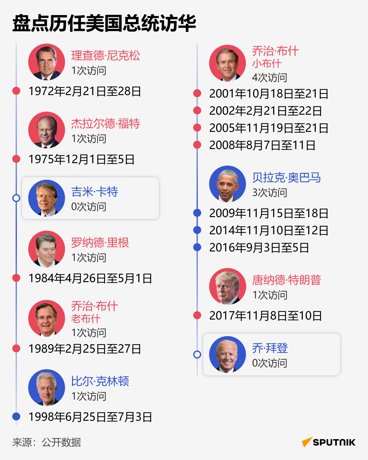 細(xì)心的俄羅斯衛(wèi)星通訊社盤(pán)點(diǎn)歷任美國(guó)總統(tǒng)訪華記錄,五十二年間10位中8位13次訪問(wèn)中國(guó)。