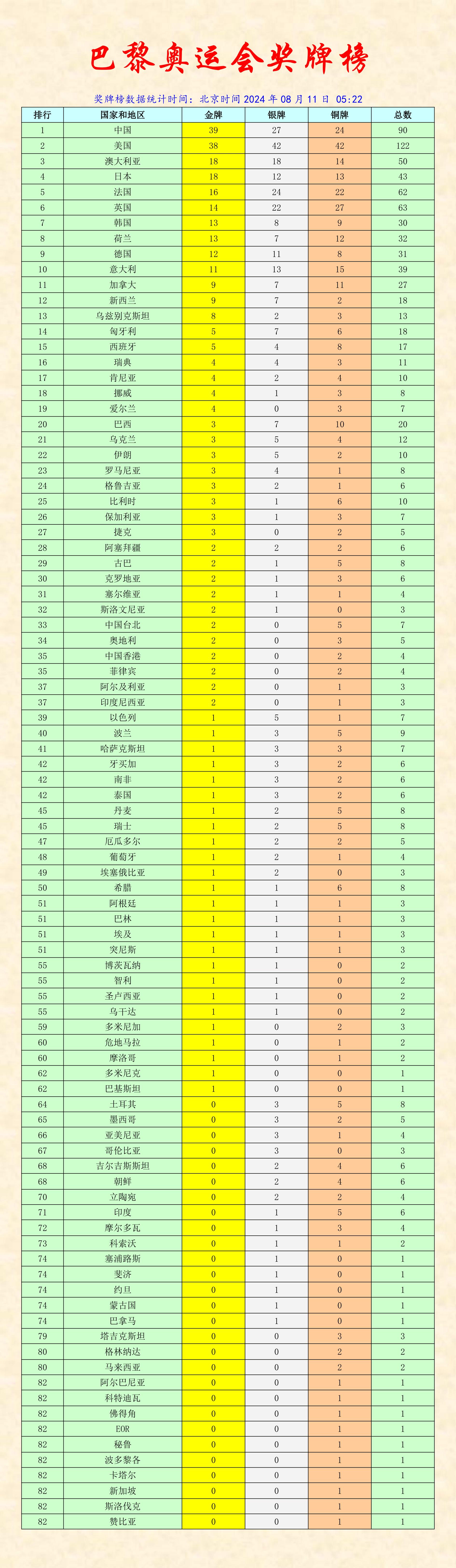 感悟巴黎奧運會獎牌榜——看看最后三日總成績