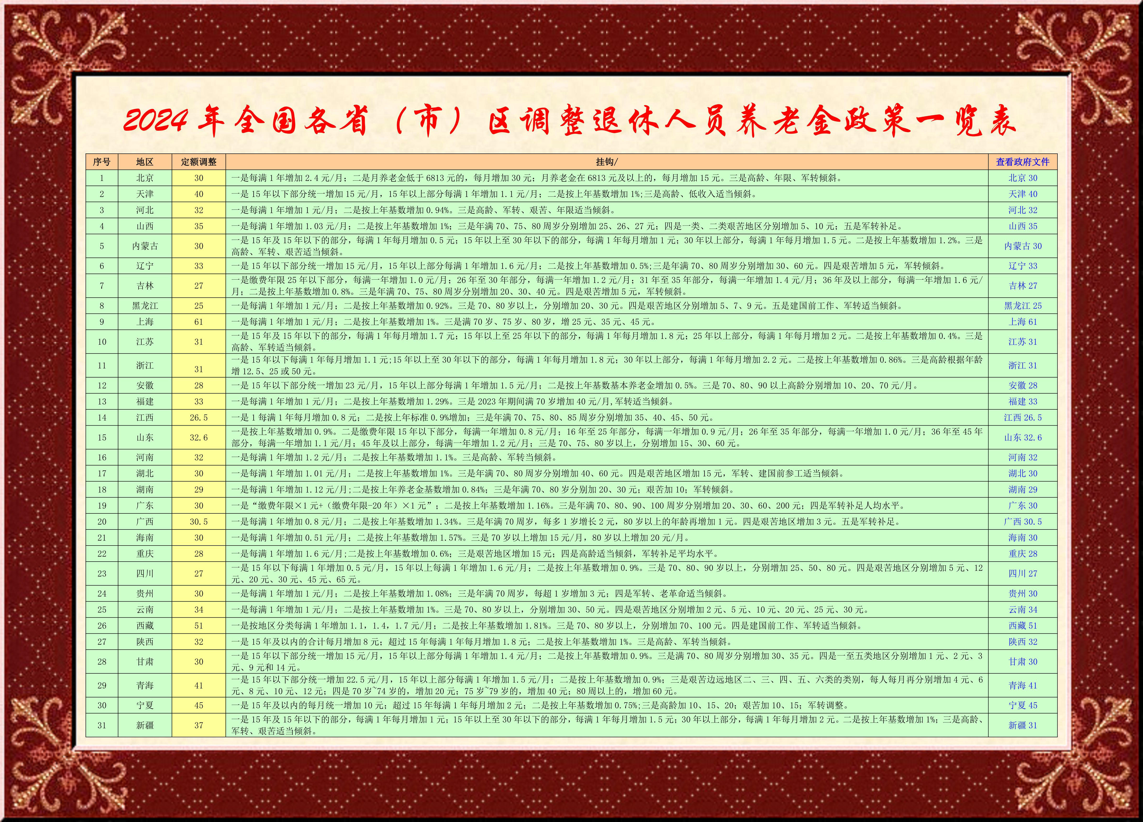 2024年全國(guó)31個(gè)?。ㄊ校┳灾螀^(qū)退休人員調(diào)整基本養(yǎng)老金已經(jīng)落實(shí)到位,一年一度1.4億退休人員得到了實(shí)實(shí)在在的實(shí)惠,這是黨中央和各級(jí)人民政府把人民生活放在第一位的偉大功績(jī),可圈可點(diǎn),令人欣慰!