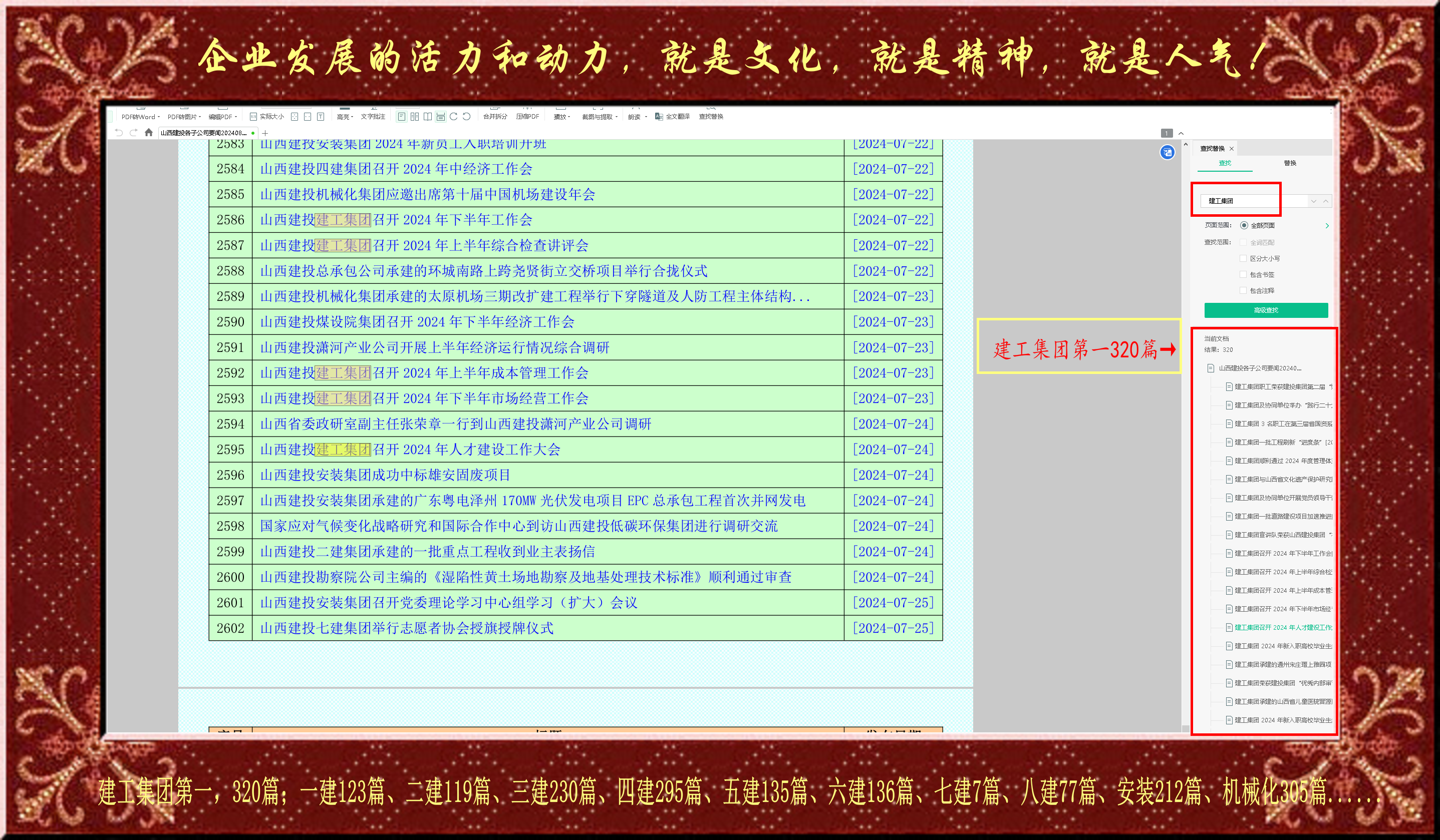 觀察一個(gè)企業(yè)綜合素質(zhì),最簡(jiǎn)單也是最直觀的辦法就是看他的信息發(fā)布量和信息內(nèi)容,這是多年來我的體會(huì)。企業(yè)發(fā)展的活力和動(dòng)力,就是文化,就是精神,就是人氣!我把2669篇文章標(biāo)題和摘要用PDF格式匯總在一張表格里,便于統(tǒng)計(jì)各公司報(bào)送母集團(tuán)公司的信息數(shù)量。建工集團(tuán)第一,320篇;一建123篇、二建119篇、三建230篇、四建295篇、五建135篇、六建136篇、七建7篇、八建77篇、安裝212篇、機(jī)械化305篇......