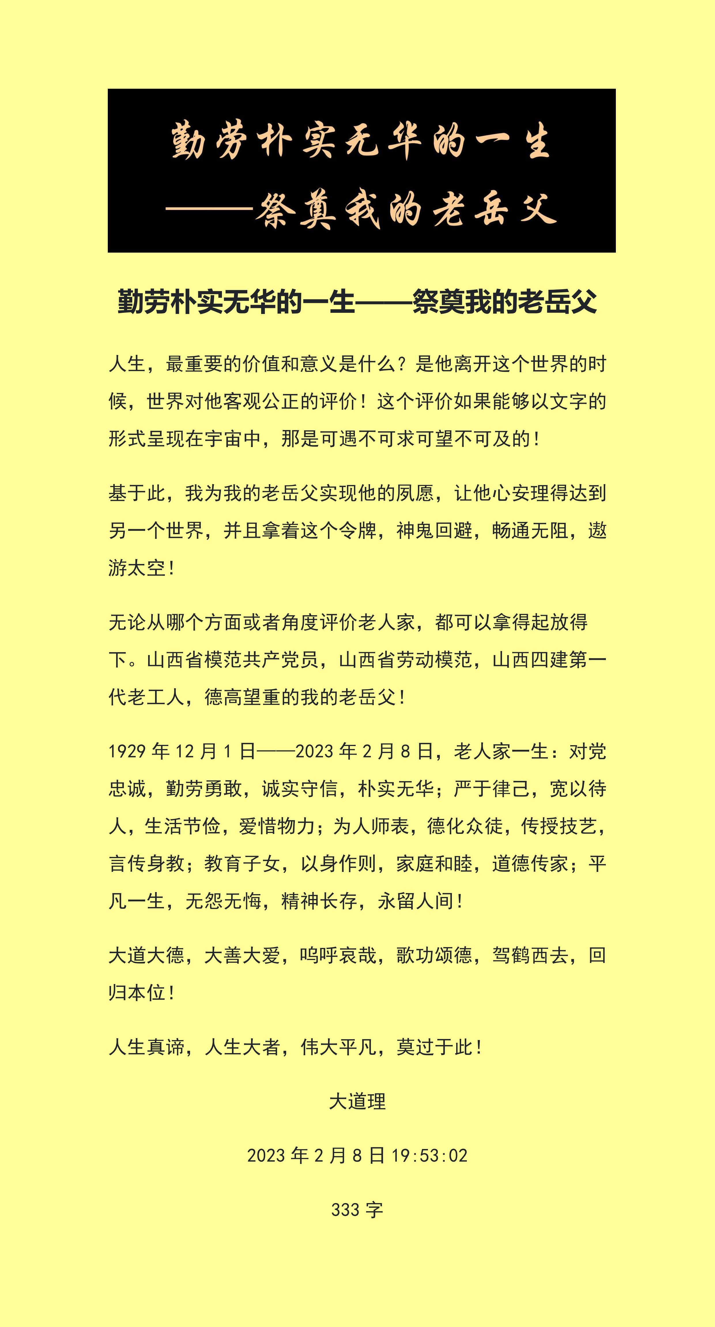 1929年12月1日——2023年2月8日,老人家一生:對黨忠誠,勤勞勇敢,誠實守信,樸實無華;嚴于律己,寬以待人,生活節(jié)儉,愛惜物力;為人師表,德化眾徒,傳授技藝,言傳身教;教育子女,以身作則,家庭和睦,道德傳家;平凡一生,無怨無悔,精神長存,永留人間!