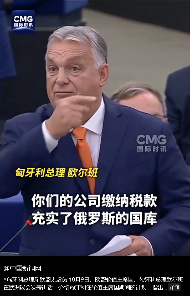 馮德萊恩發(fā)言期間在為歐盟政策辯護(hù)的同時(shí),選擇通過(guò)給歐爾班和匈牙利政府扣上“親俄”、“親華”的帽子予以回?fù)?,聲稱歐爾班與俄總統(tǒng)普京交好,允許來(lái)自中俄的“外國(guó)干涉,讓匈牙利人民失望”。