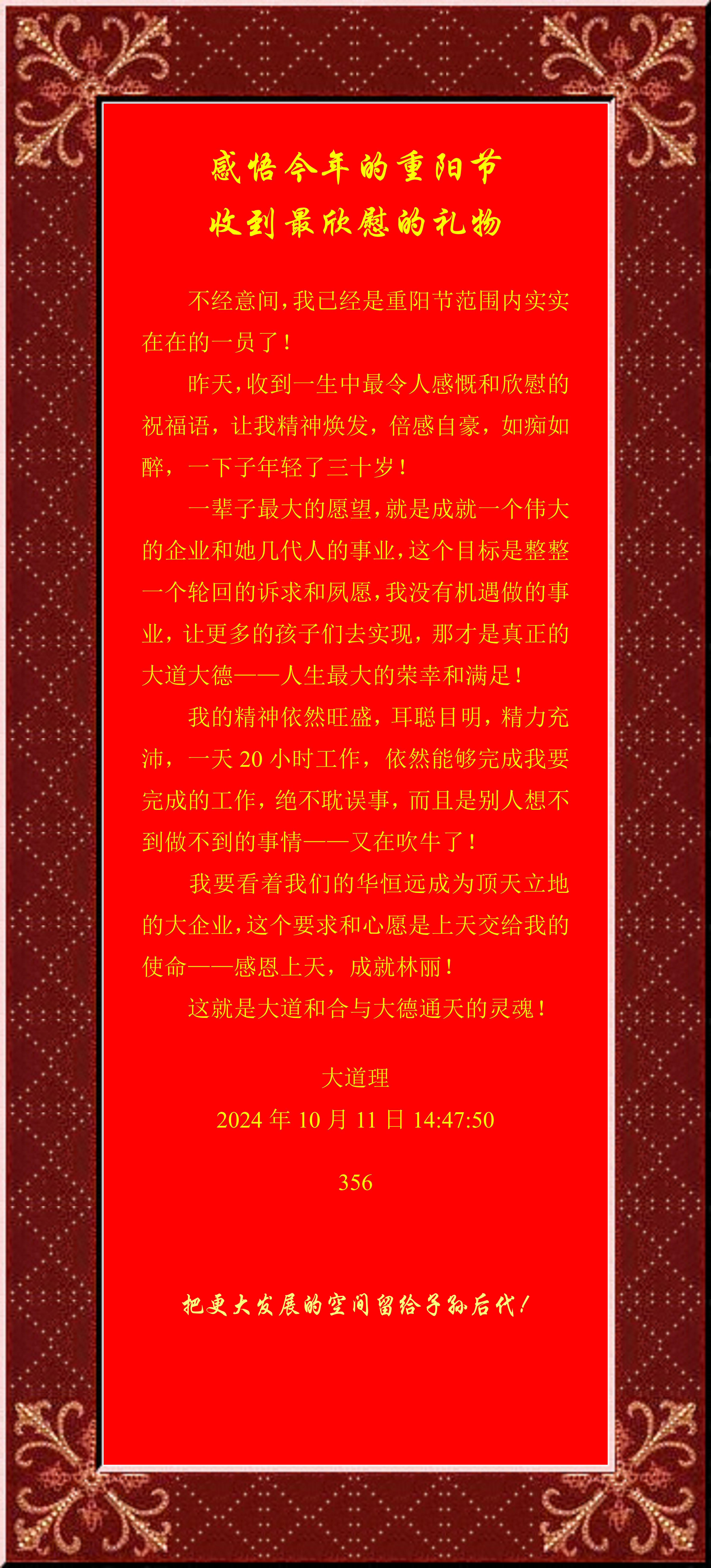 一輩子最大的愿望,就是成就一個(gè)偉大的企業(yè)和她幾代人的事業(yè),這個(gè)目標(biāo)是整整一個(gè)輪回的訴求和夙愿,我沒(méi)有機(jī)遇做的事業(yè),讓更多的孩子們?nèi)?shí)現(xiàn),那才是真正的大道大德——人生最大的榮幸和滿(mǎn)足!