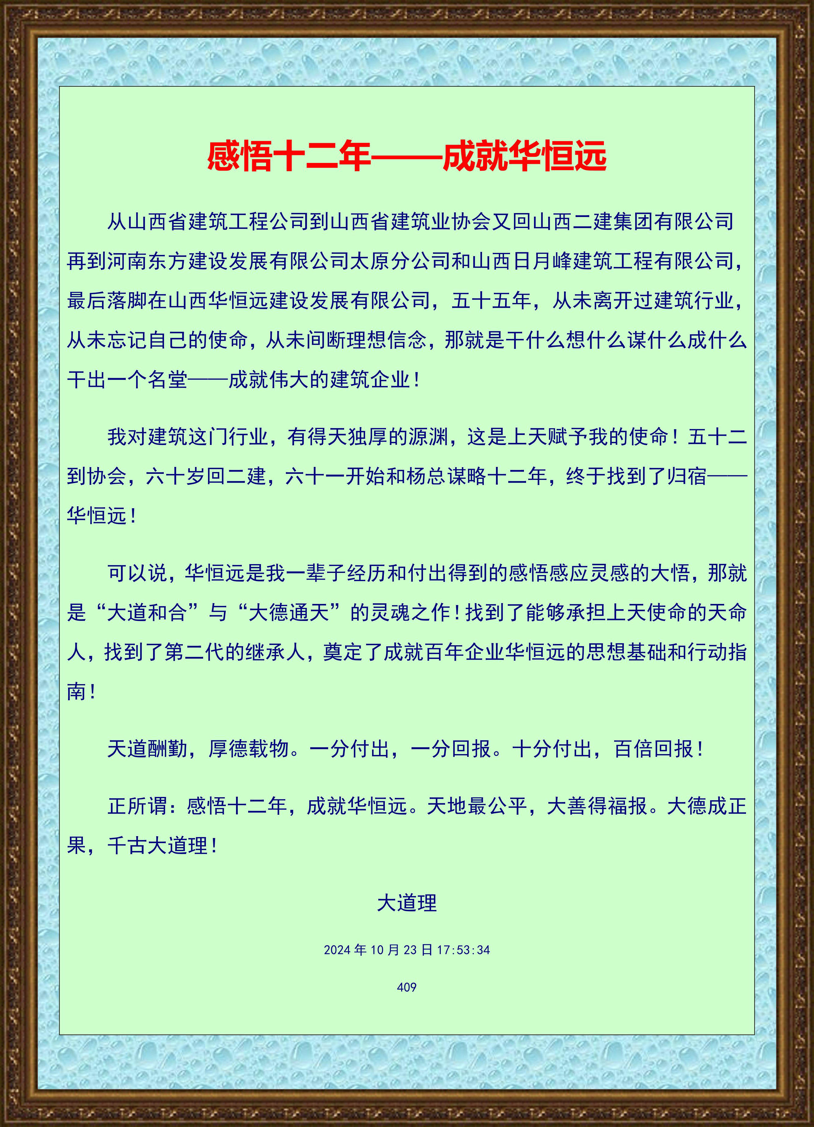 我對(duì)建筑這門行業(yè),有得天獨(dú)厚的源淵,這是上天賦予我的使命!五十二到協(xié)會(huì),六十歲回二建,六十一開始和楊總謀略十二年,終于找到了歸宿——華恒遠(yuǎn)!