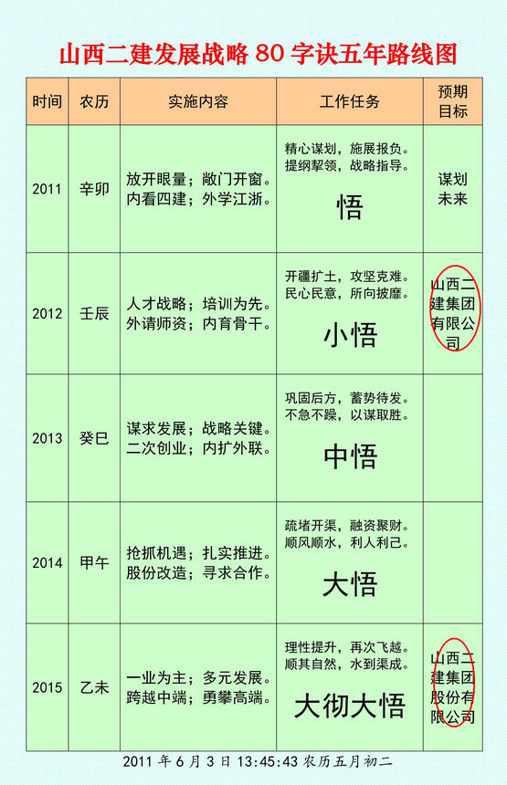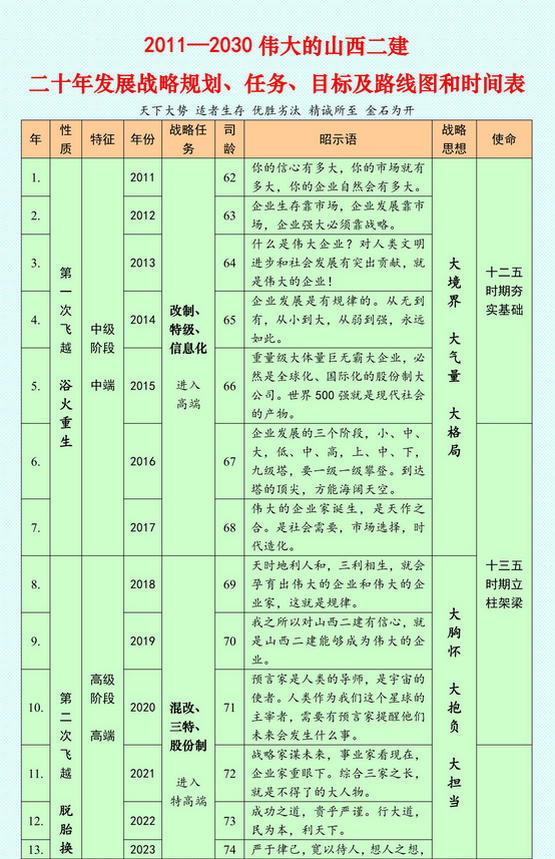 山西二建發(fā)展戰(zhàn)略五年路線圖和時(shí)間表,從2011年到2020年,分兩個(gè)五年兩個(gè)階段規(guī)劃了十年的成就,是考慮現(xiàn)實(shí)和實(shí)際的可能性與變化的環(huán)境形成的階段性感悟程度。換言之,就看決策者的維度能否自覺(jué)接受并且堅(jiān)定不移去執(zhí)行!任何事物,懷疑或者遲滯,必將功虧一簣事倍功半!重回大道,二十年以后的事情了!