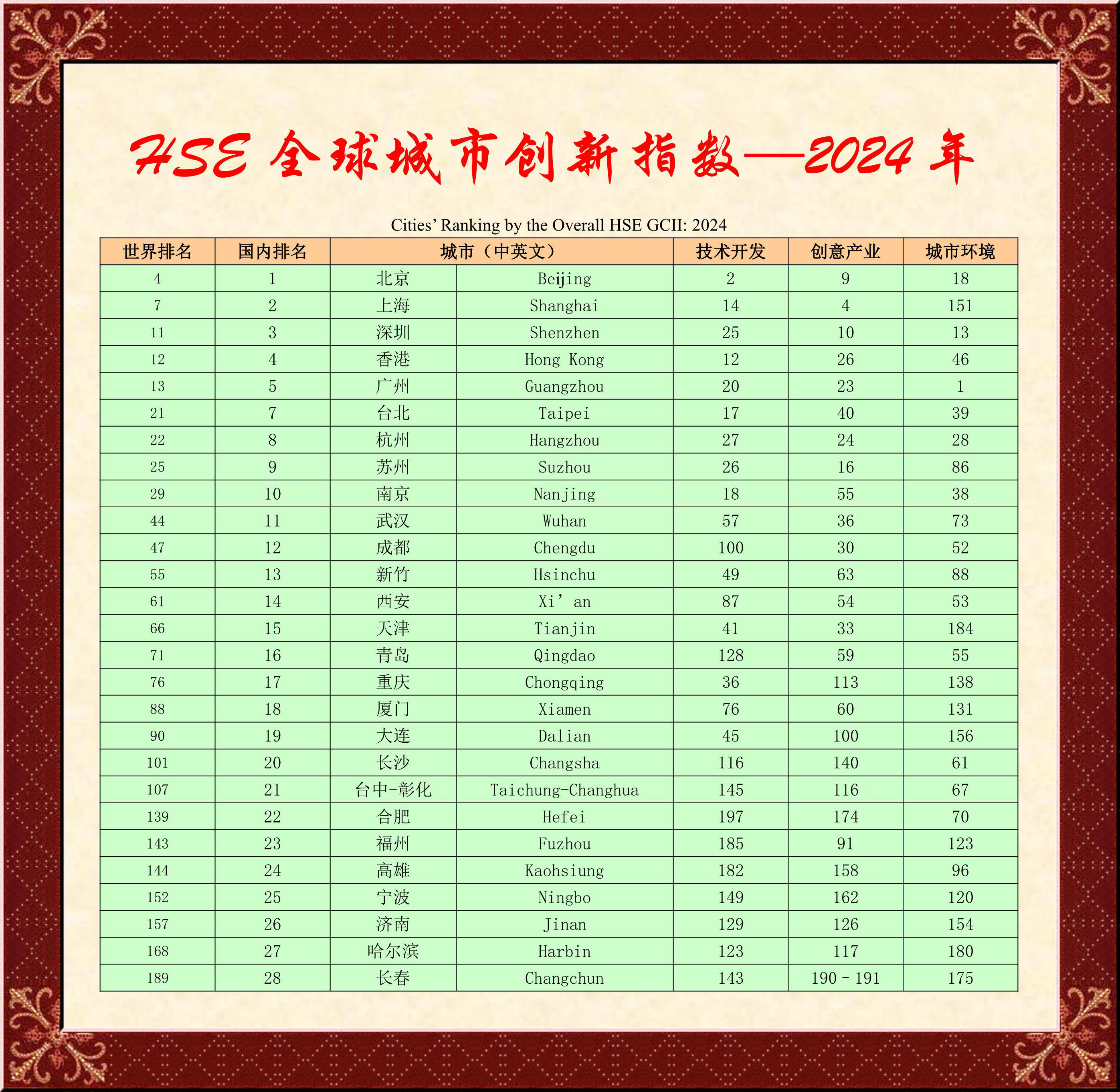 HSE全球城市創(chuàng)新指數(shù)—2024年中國(guó)的28座城市名錄