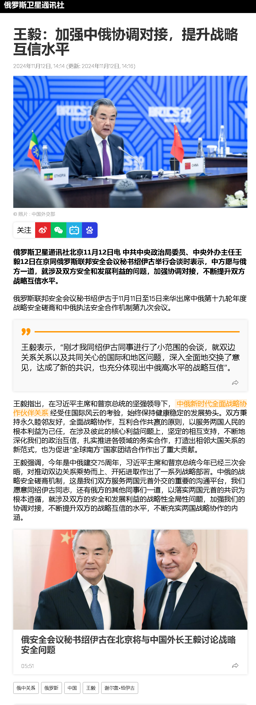 根據(jù)俄羅斯官方消息,11號至14號,俄羅斯安全會議秘書、前國防部長紹伊古要對中國展開工作訪問。期間,紹伊古會與中央外辦主任王毅等中方高層官員會面,俄媒還透露稱,紹伊古計劃在中國舉行重要磋商??催@架勢,紹伊古此行,顯然是有大事要和中國談,而且大概率是和特朗普再次當(dāng)選美國總統(tǒng),并可能導(dǎo)致俄烏局勢出現(xiàn)新走向有關(guān)。