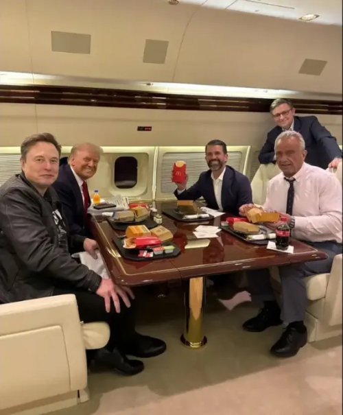 在飛機(jī)上吃飯的時(shí)候,美國(guó)眾議院院長(zhǎng),政治意義上的三把手約翰遜站著,而馬斯克不僅坐著還坐在特朗普身邊。