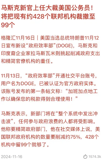 特朗普宣布將成立“政府效率部(DOGE)”,交給馬斯克和印度裔企業(yè)家拉瑪斯瓦米掌管,唯一目的就是給美國(guó)政府進(jìn)行裁員。