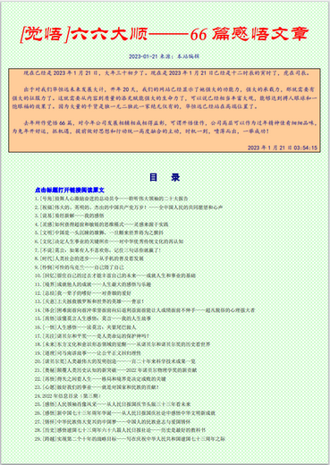 這是2019年3月9日至9月13日在日月峰網(wǎng)上發(fā)布過的46篇人生實(shí)踐體驗(yàn)和體會(huì),以《[座標(biāo)]找準(zhǔn)自己的人生位置》起頭,到《中秋寄語》收尾,寓意事物發(fā)展從無到有從初一到十五的規(guī)律和法則,即感悟到感應(yīng)形成靈感的過程,把屬于自己的潛意識(shí)激活,明白事物發(fā)生發(fā)展全過程和預(yù)見未來的真功夫,可以說這是我人生最大的財(cái)富和為后代準(zhǔn)備的最有價(jià)值的禮物!