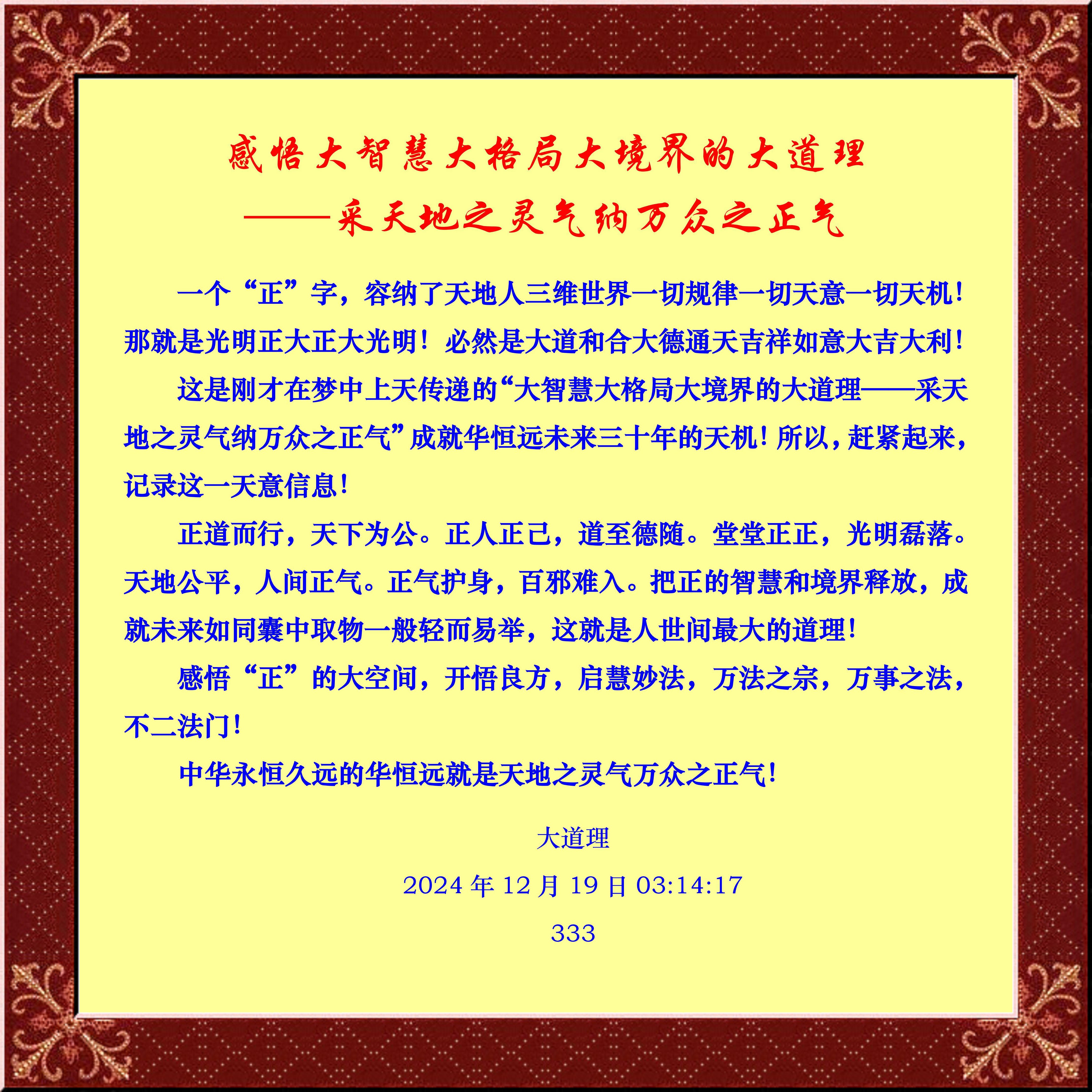 一個“正”字,容納了天地人三維世界一切規(guī)律一切天意一切天機!那就是光明正大正大光明!必然是大道和合大德通天的吉祥如意大吉大利!