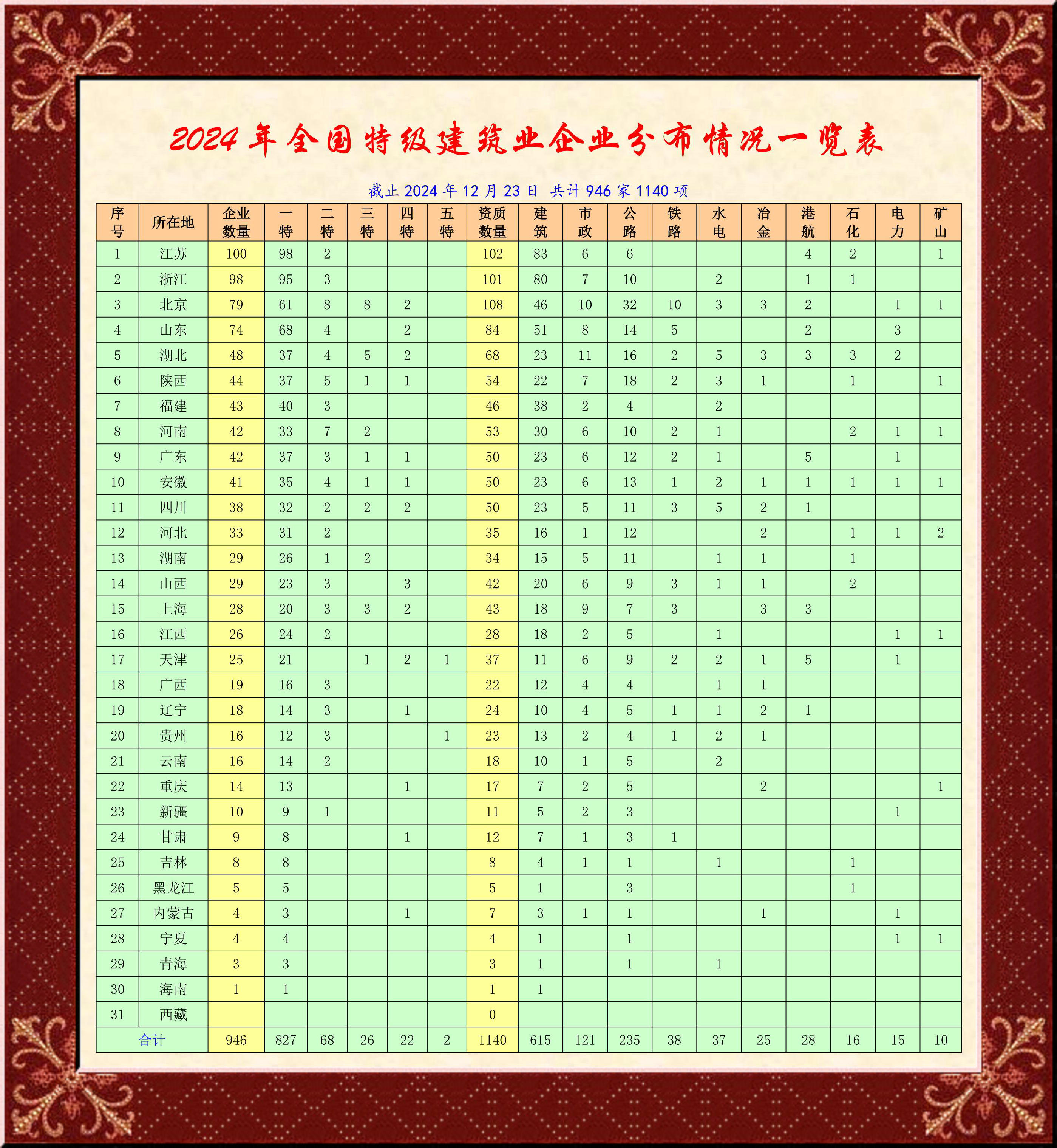 2024年核準(zhǔn)建筑業(yè)企業(yè)特級(jí)資質(zhì)名單