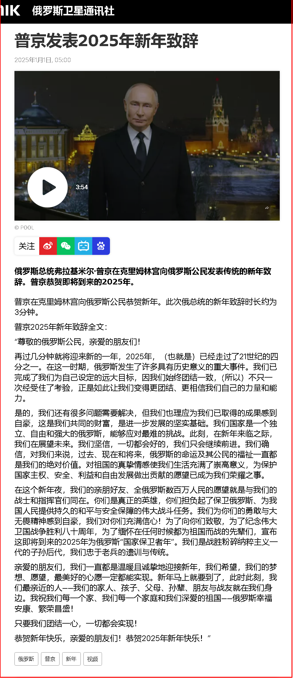 俄羅斯總統(tǒng)普京2025年新年致辭,向全世界發(fā)出一個(gè)強(qiáng)烈信號(hào)——那就是開(kāi)創(chuàng)人類(lèi)社會(huì)公平正義的新世界!