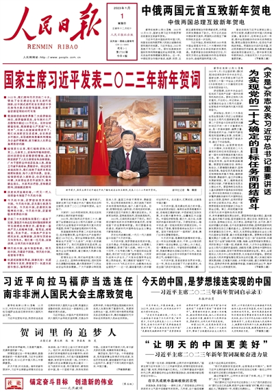 2013年元旦《人民日報》發(fā)表胡錦濤《攜手促進(jìn)世界和平與共同發(fā)展》的新年賀詞,《讓我們一起成就夢想》的元旦獻(xiàn)詞。