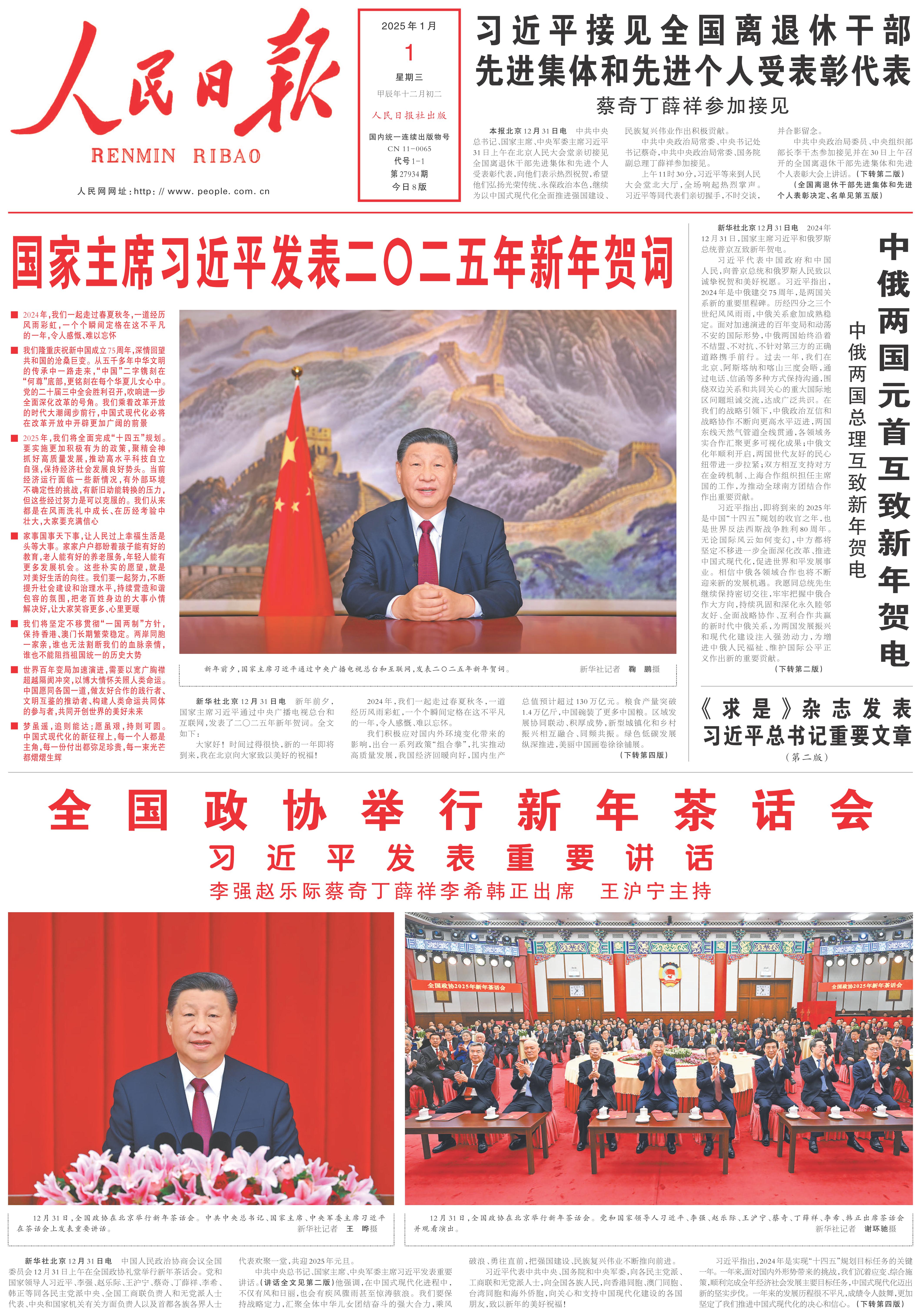 2015年元旦《人民日報》發(fā)表《國家主席習(xí)近平發(fā)表二〇一五年新年賀詞》。