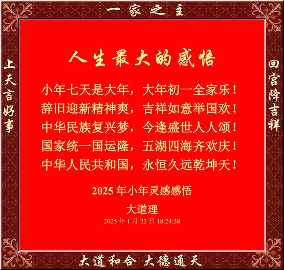 只要你真正達(dá)到上天的高度,自然理解我的預(yù)言無(wú)懈可擊!什么是大智慧?能夠決定一切事物而不進(jìn)入事物!什么是大格局?能夠左右一切事物而不參與事物!什么是大境界?能夠成就一切事物而不收納事物!天人合一,大道和合,大德通天,大道至簡(jiǎn),大象無(wú)形——上天(大自然)的必然和自然規(guī)律!