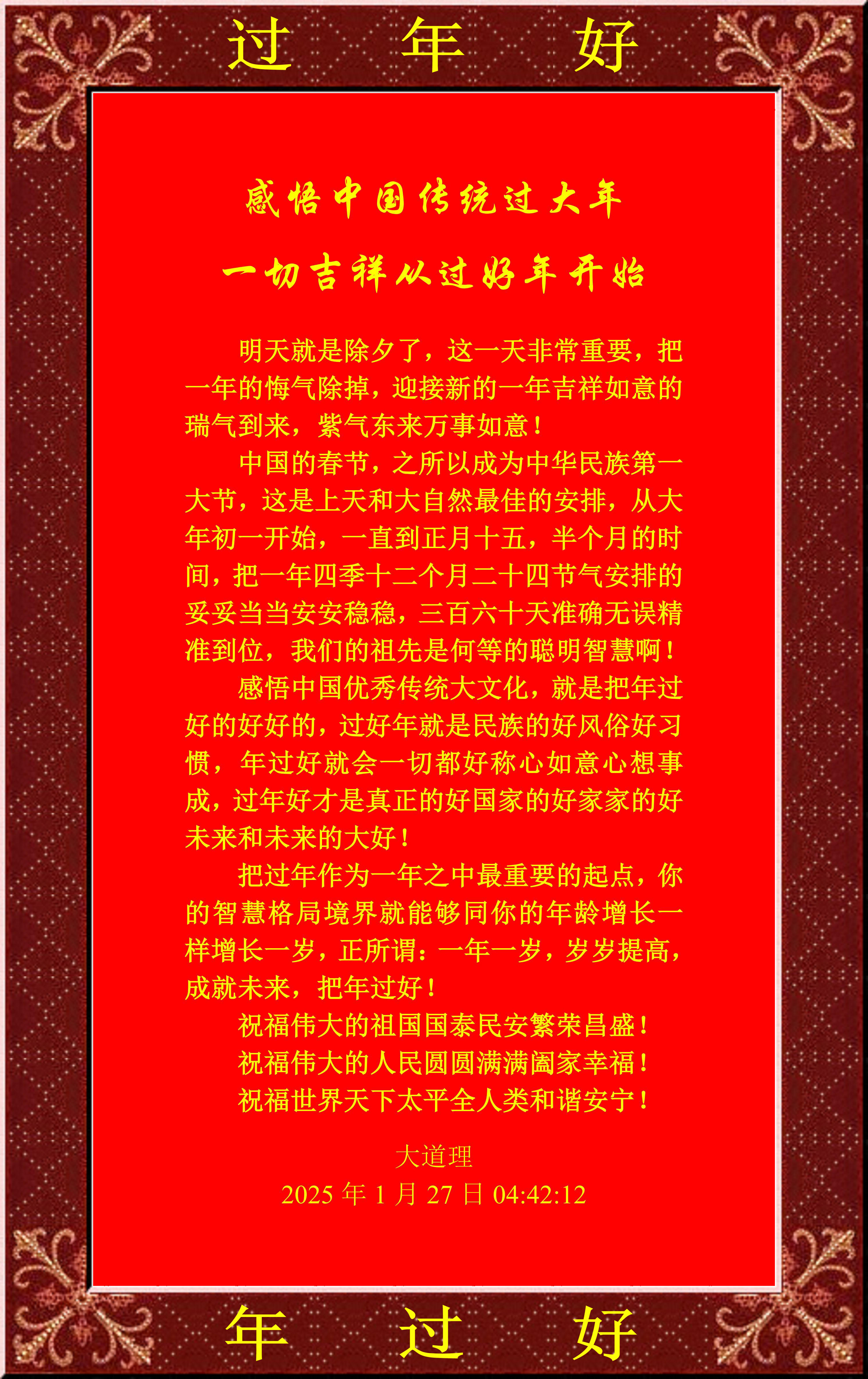 感悟中國優(yōu)秀傳統(tǒng)大文化,就是把年過好的好好的,過好年就是民族的好風(fēng)俗好習(xí)慣,年過好就會一切都好稱心如意心想事成,過年好才是真正的好國家的好家家的好未來和未來的大好!