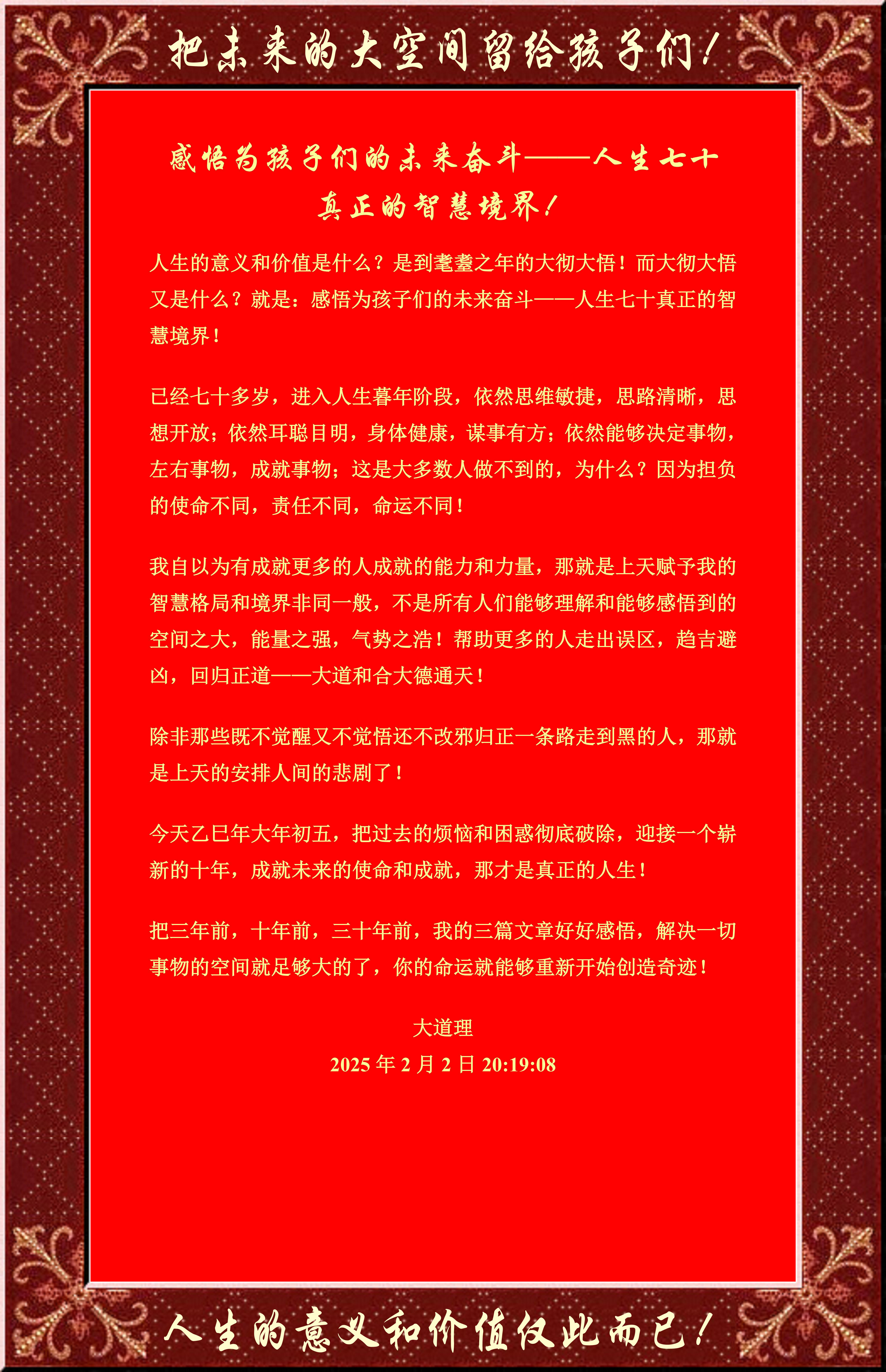 人生的意義和價(jià)值是什么?是到耄耋之年的大徹大悟!而大徹大悟又是什么?就是:感悟?yàn)楹⒆觽兊奈磥韸^斗——人生七十真正的智慧境界!
