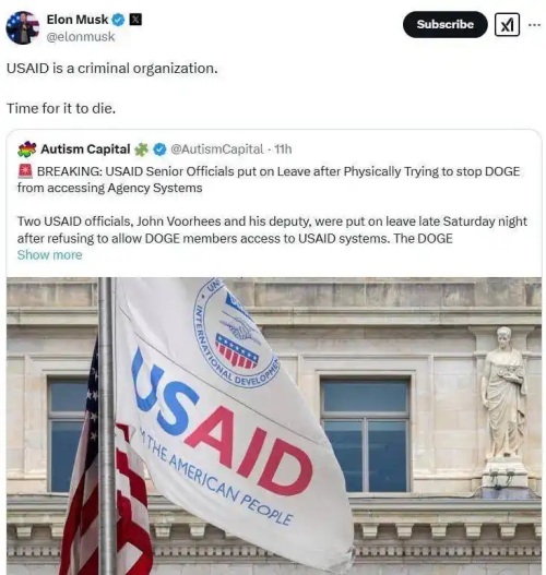政府效率部負(fù)責(zé)人馬斯克在X上發(fā)文稱,美國國際開發(fā)署“是一個(gè)犯罪組織,是時(shí)候讓它消亡了”網(wǎng)絡(luò)截圖