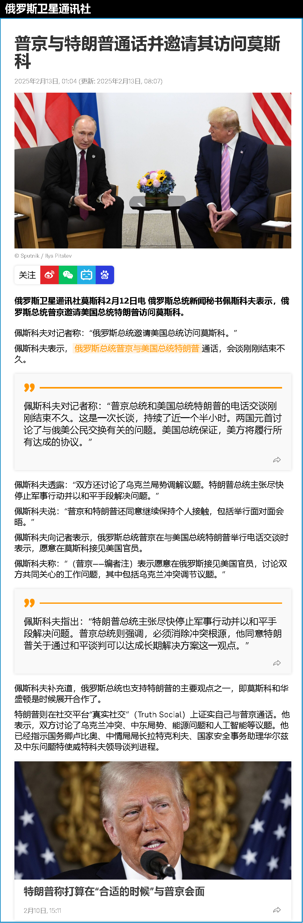 俄總統(tǒng)新聞秘書佩斯科夫當(dāng)天說,俄美兩國元首在通話中同意組織兩人的會晤,普京邀請?zhí)乩势赵L問莫斯科。特朗普在社交媒體上表示,美俄雙方同意就結(jié)束俄烏沖突進(jìn)行“緊密合作”,并派遣各自團(tuán)隊(duì)“立即開始談判”。