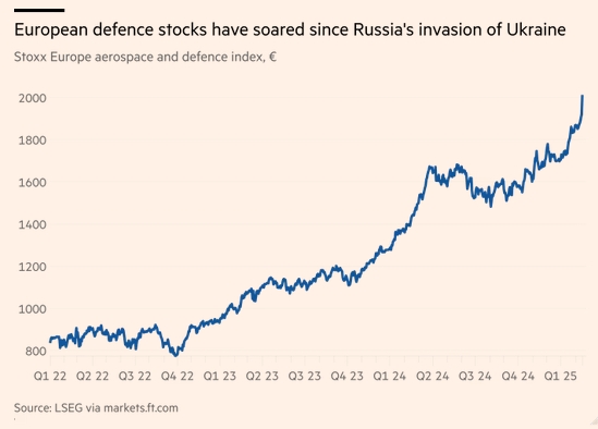 《金融時報》指出,歐盟各國的官方數(shù)據(jù)顯示,從俄烏沖突爆發(fā)前的2021年到爆發(fā)后的2024年,其國防總開支增長超過30%,預(yù)計總金額達3260億歐元,約占成員國GDP的1.9%。隨之共同飆升的還有歐洲各大軍火商的股價。報道說,自2022年2月以來,萊茵金屬的股價已上漲近三倍。