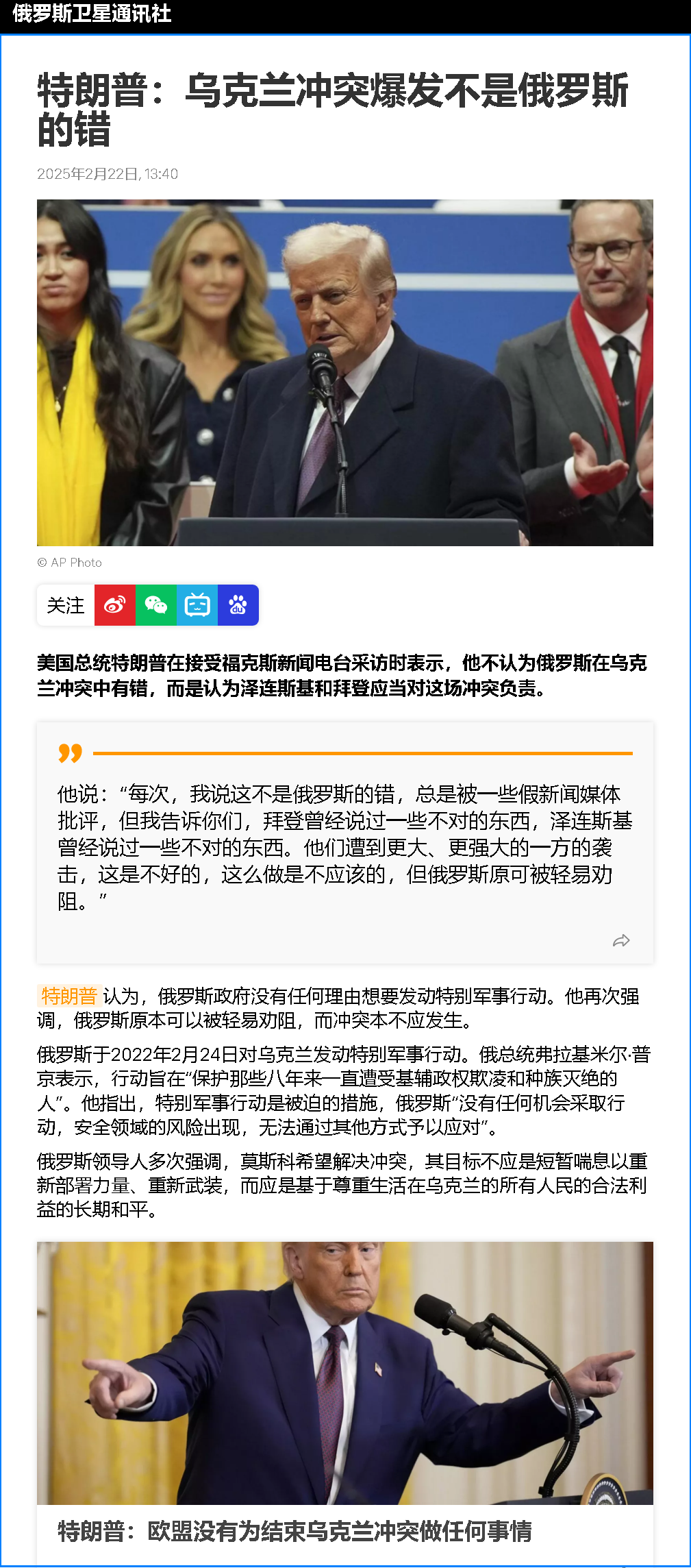 特朗普當(dāng)天在接受美國(guó)媒體采訪(fǎng)時(shí)說(shuō),他觀察澤連斯基“多年了”,“我看到他(澤連斯基)在談判過(guò)程中沒(méi)牌可出,他沒(méi)有牌?!?