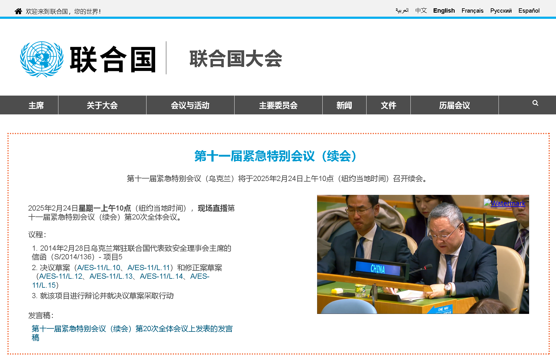第十一屆緊急特別會(huì)議(烏克蘭)將于2025年2月24日上午10點(diǎn)(紐約當(dāng)?shù)貢r(shí)間)召開(kāi)續(xù)會(huì)。