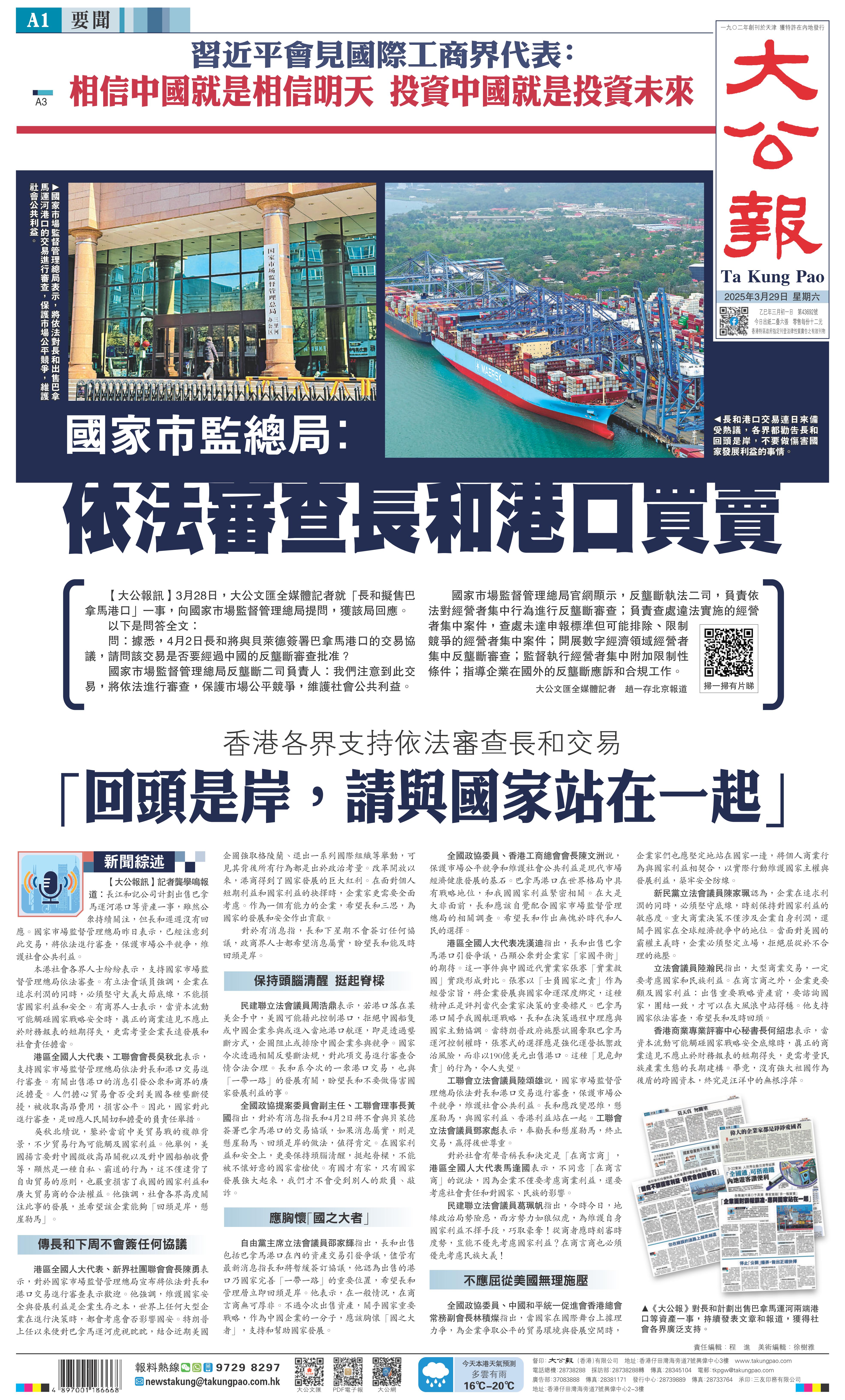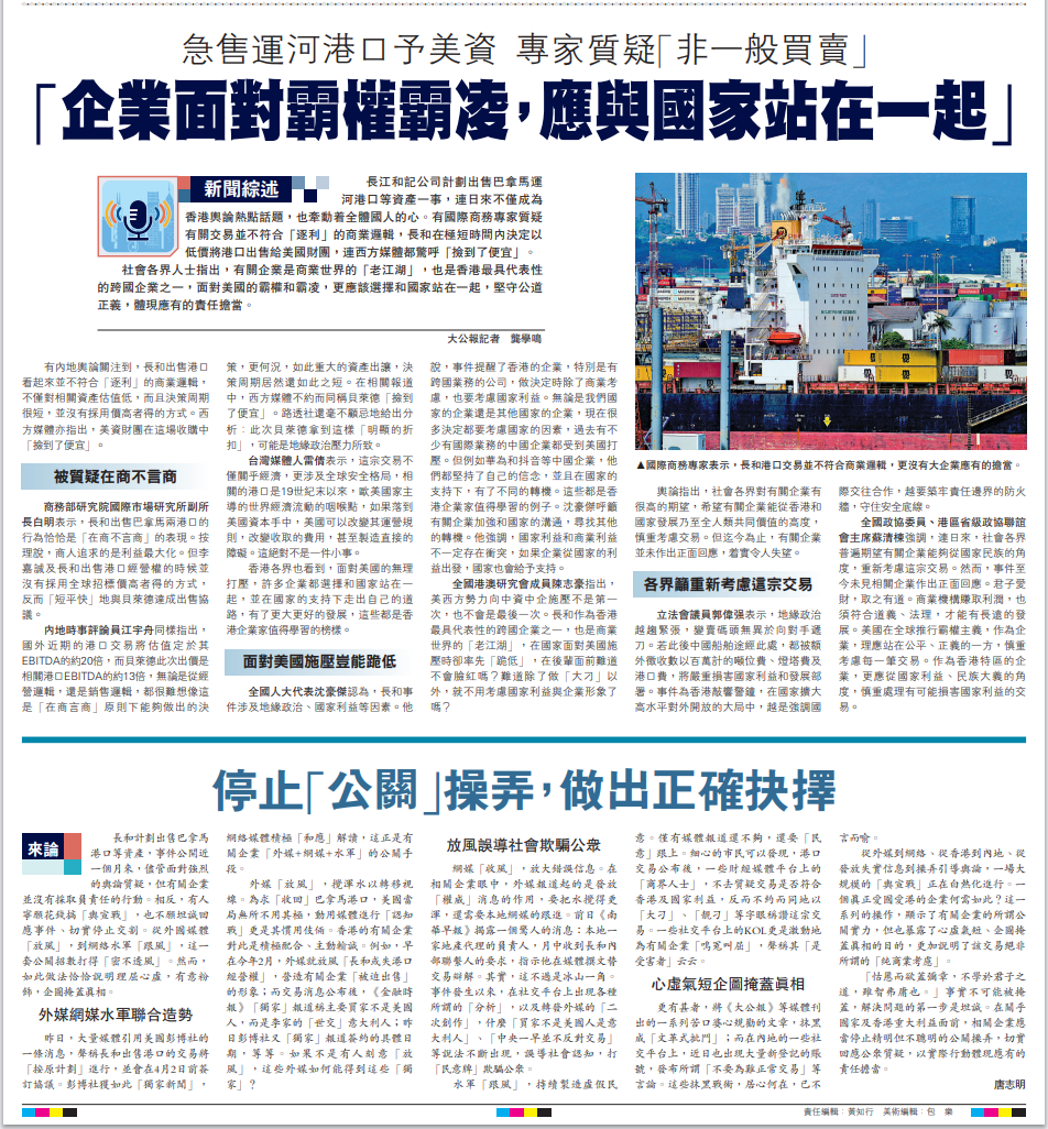 長和事件持續(xù)熱議 各界吁算好國家發(fā)展大賬 “營商不顧國家利益,終究會自毀基石”2025-03-26