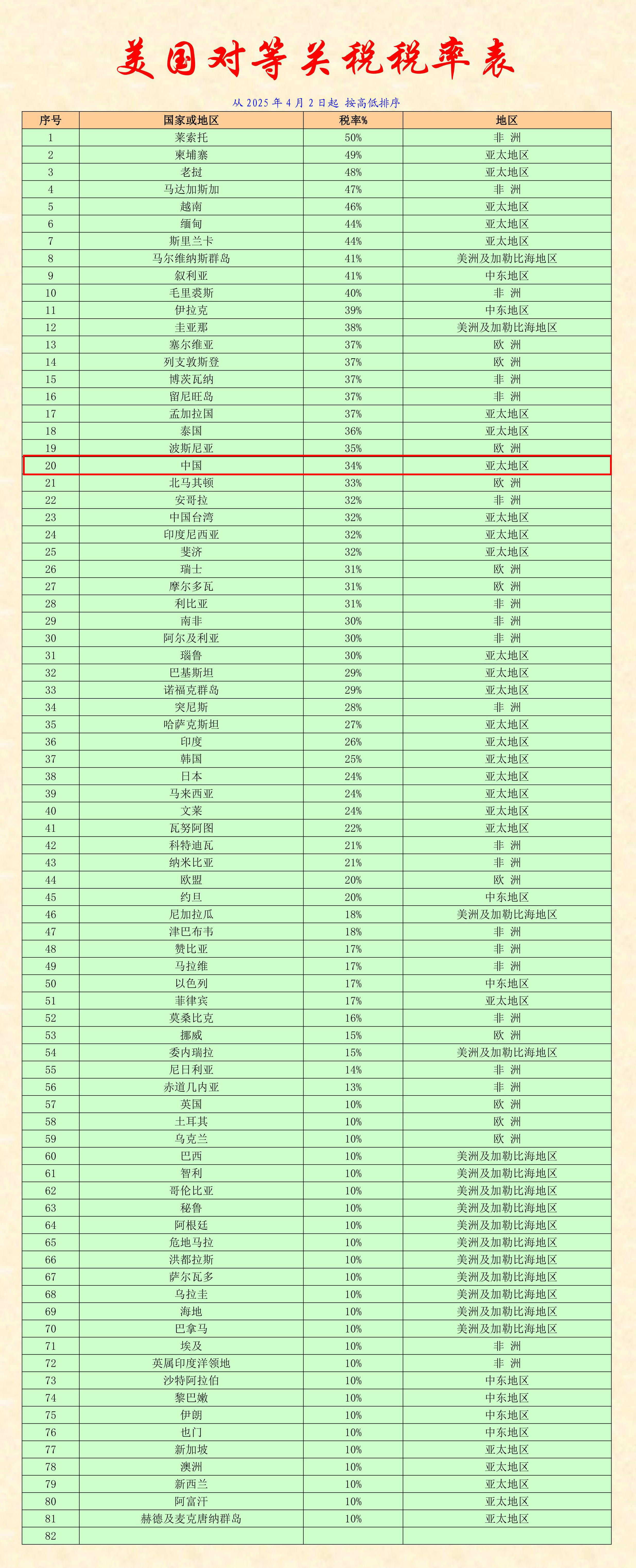 部分國(guó)家及地區(qū)對(duì)等關(guān)稅稅率