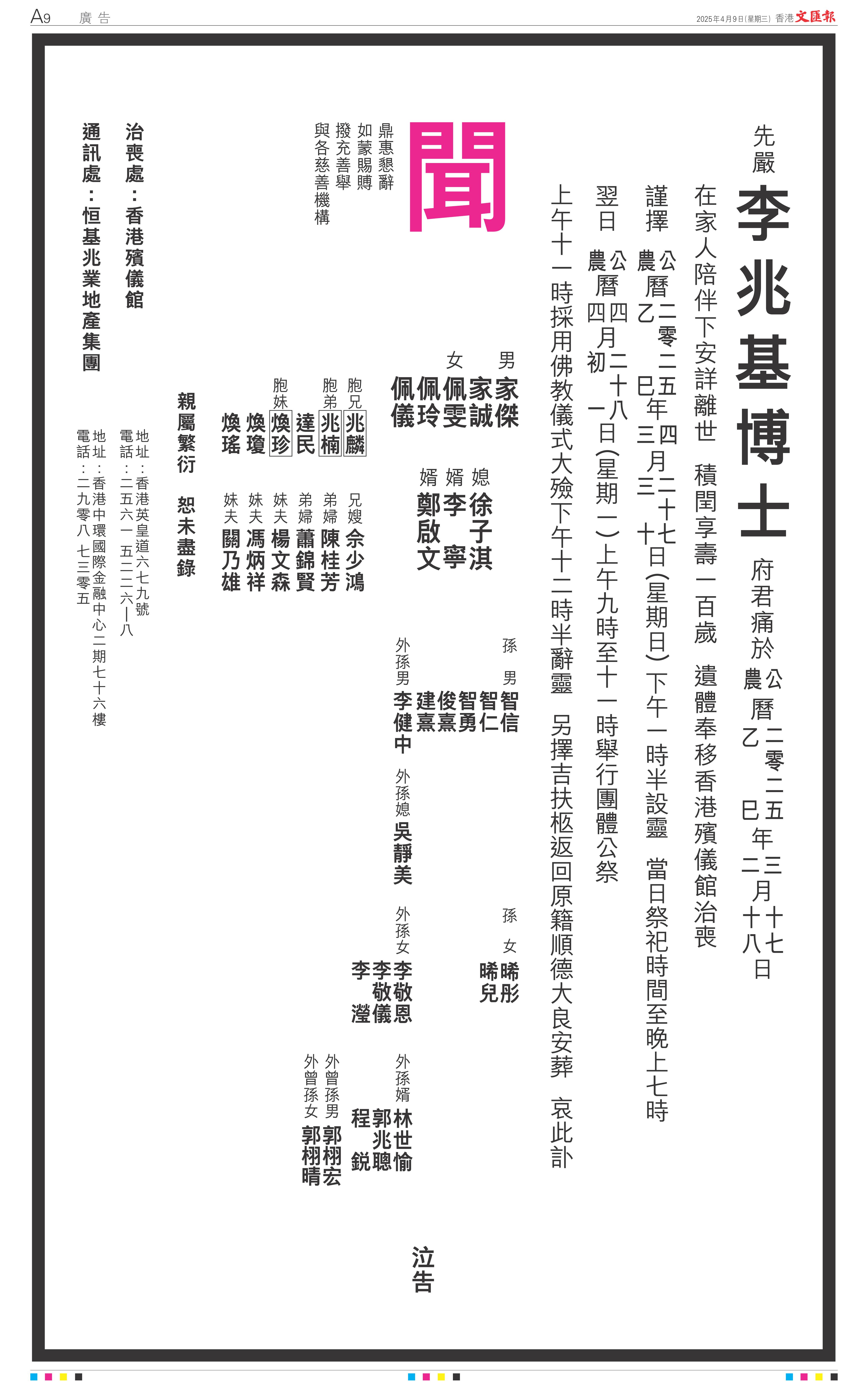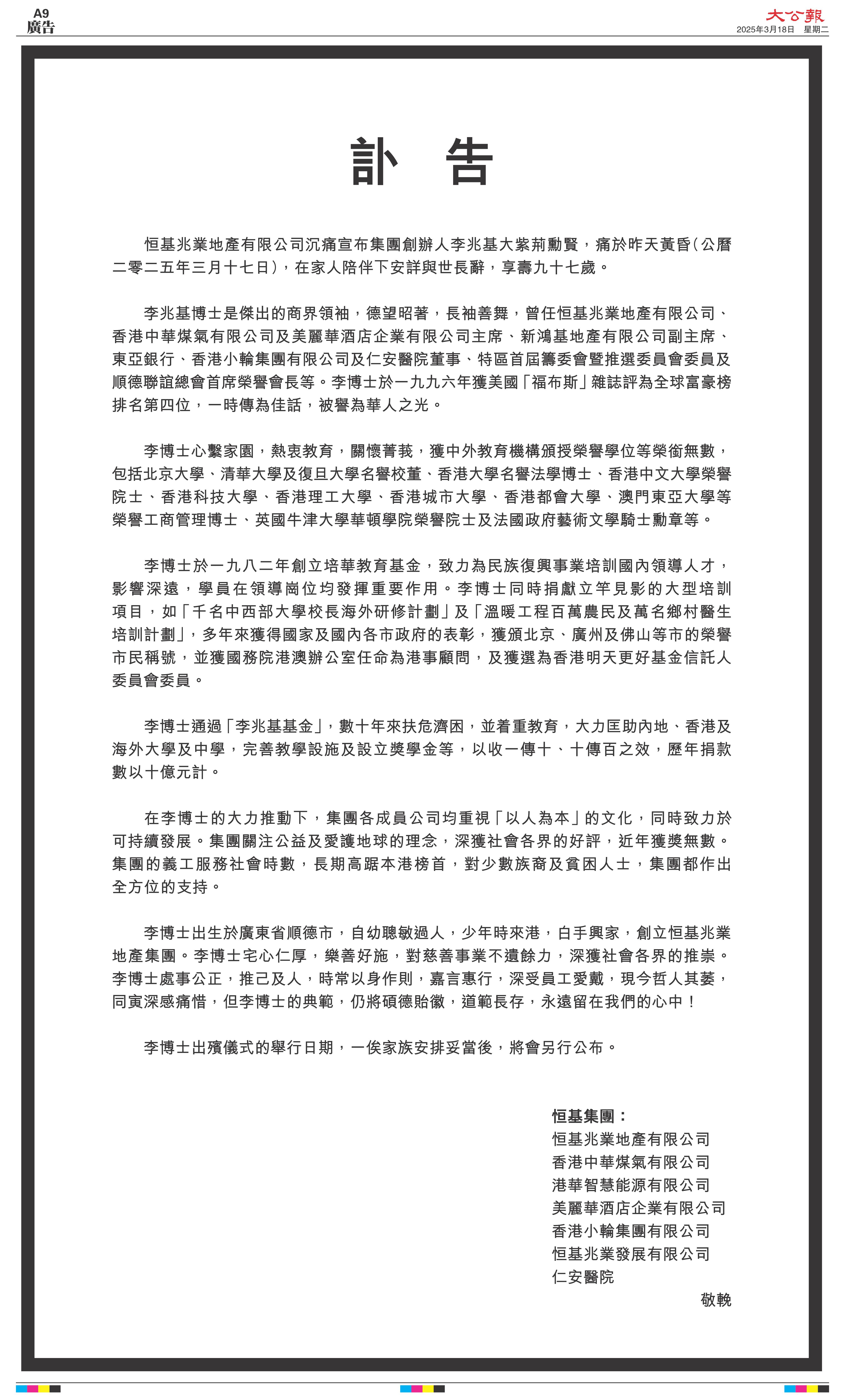 卸任恒基兆業(yè)主席,由兒子李家傑、李家誠接管