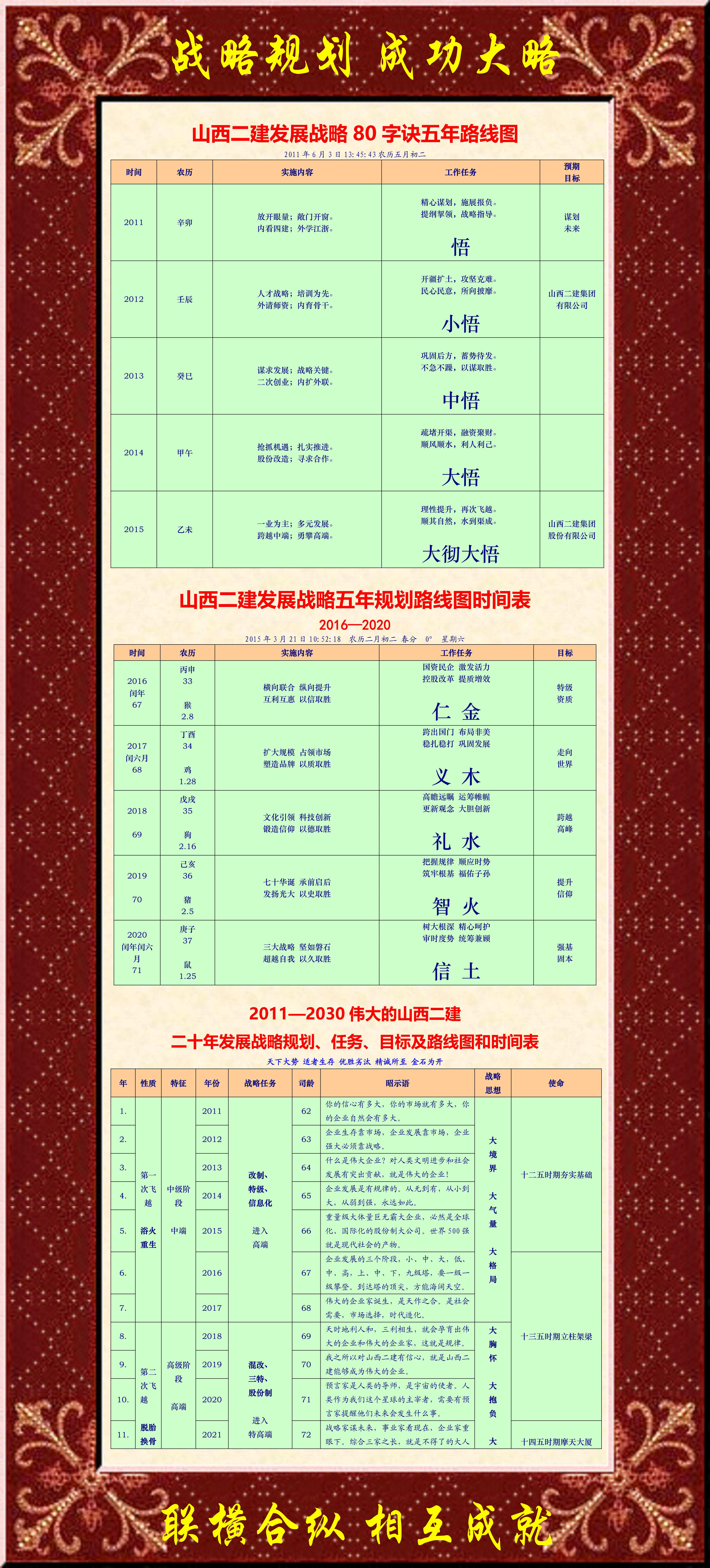 把《2011—2030 偉大的山西二建二十年發(fā)展戰(zhàn)略規(guī)劃、任務(wù)、目標(biāo)及路線圖和時(shí)間表》,藍(lán)圖已經(jīng)繪就,你要是真正讀懂了,并且照?qǐng)D去做,你就是未來的大企業(yè)家!