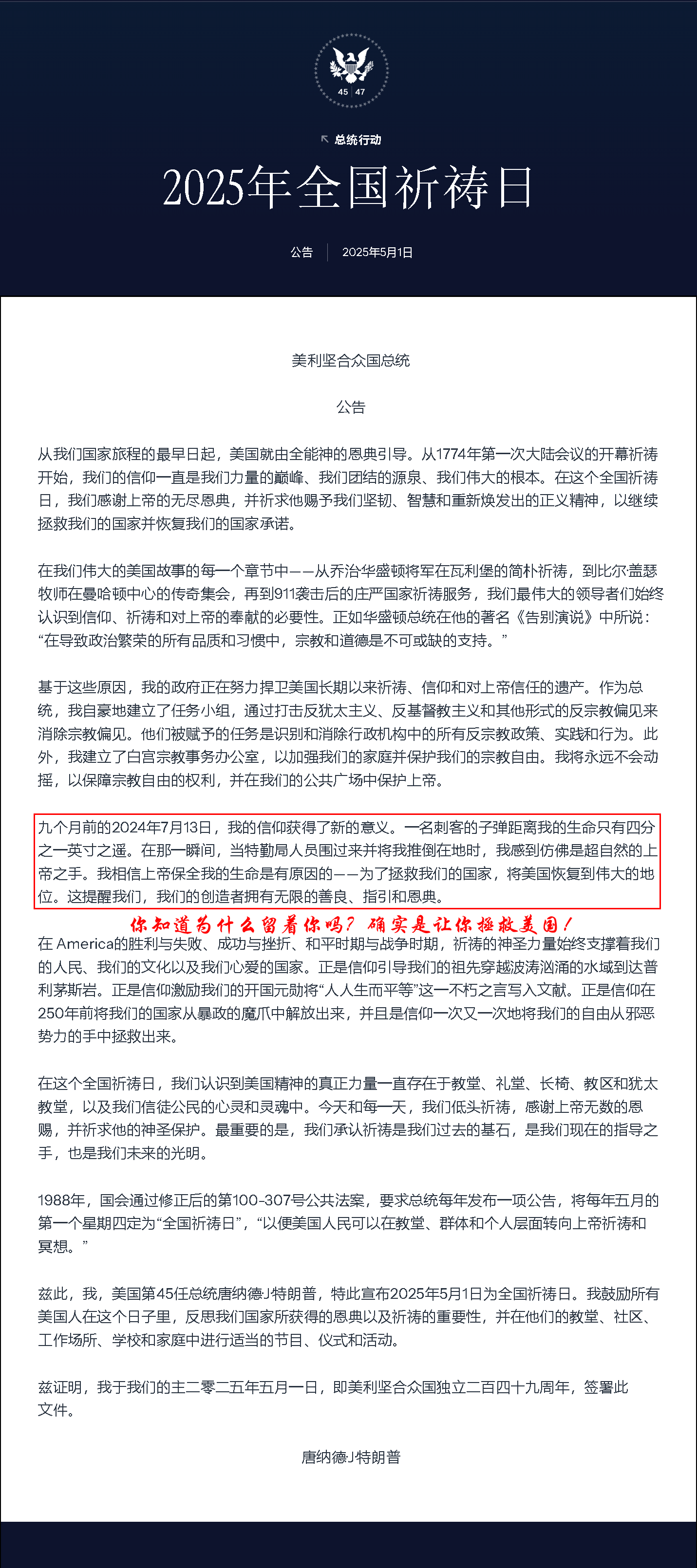 茲此,我,美國第45任總統(tǒng)唐納德·J·特朗普,特此宣布2025年5月1日為全國祈禱日。我鼓勵所有美國人在這個日子里,反思我們國家所獲得的恩典以及祈禱的重要性,并在他們的教堂、社區(qū)、工作場所、學(xué)校和家庭中進(jìn)行適當(dāng)?shù)墓?jié)目、儀式和活動。