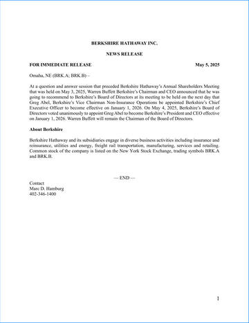 在2025年5月3日伯克希爾·哈撒韋(Berkshire Hathaway)的年度股東大會之前的問答環(huán)節(jié)上2026年。2025年5月4日,伯克希爾董事會一致投票通過任命格雷格·阿貝爾(Greg Abel),成為伯克希爾總裁兼首席執(zhí)行官,于2026年1月1日生效。沃倫·巴菲特(Warren Buffett)將繼續(xù)擔任董事會主席。