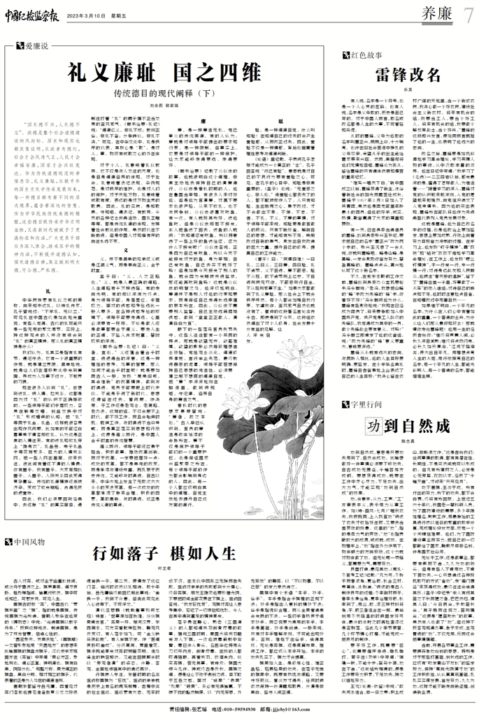 《管子》曰:“何謂四維?一曰禮,二曰義,三曰廉,四曰恥,禮不逾節(jié),義不自進(jìn),廉不蔽惡,恥不從枉。故不逾節(jié)則上位安,不自進(jìn)則民無巧詐,不蔽惡則行自全,不從枉則邪事不生?!比绻蠹叶甲龅搅硕Y義廉恥,那么社會(huì)上下就會(huì)秩序井然,每個(gè)人都會(huì)加強(qiáng)自我約束,爾虞我詐、歪風(fēng)邪氣自然也就沒有了。管仲的這段著名言論流傳千古,即使是到了今天,這段話依然道出了對(duì)個(gè)人修身、社會(huì)發(fā)展十分有益的見解,讓人深受啟發(fā)。