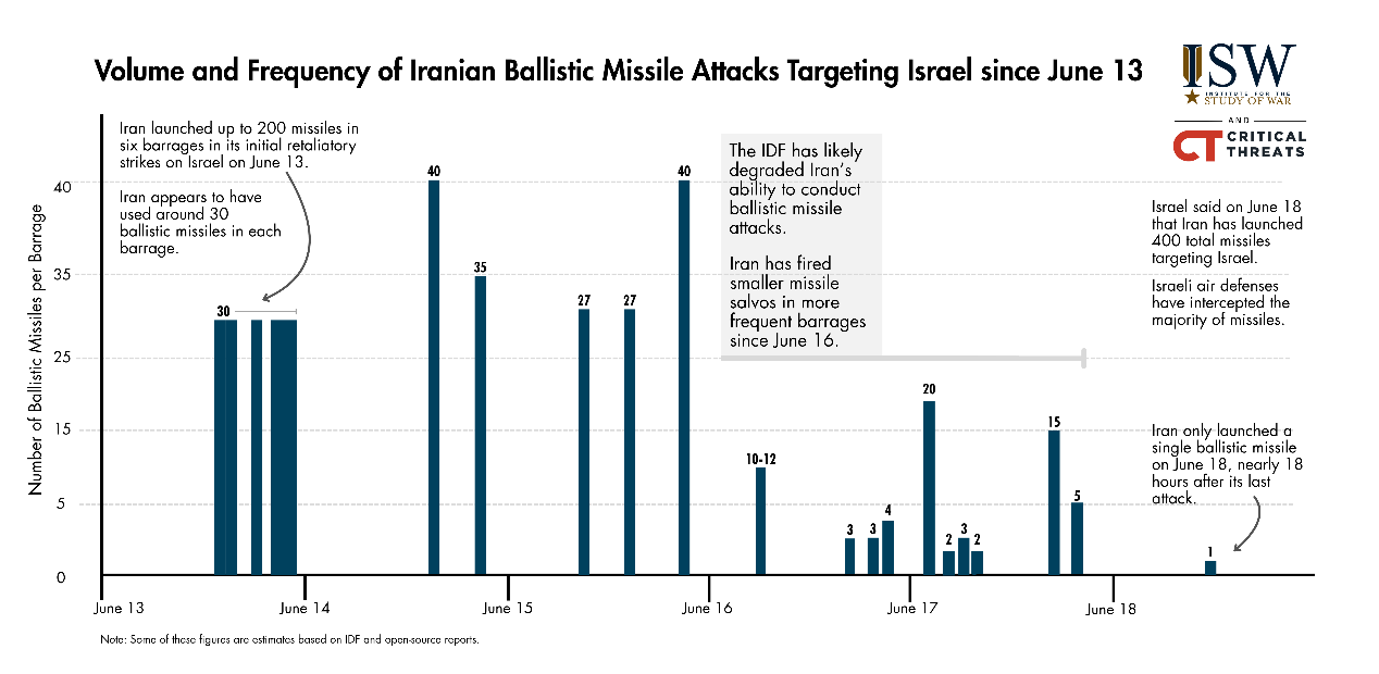 自6月13日以來,伊朗針對(duì)以色列的彈道導(dǎo)彈攻擊數(shù)量和頻率戰(zhàn)爭(zhēng)研究所
