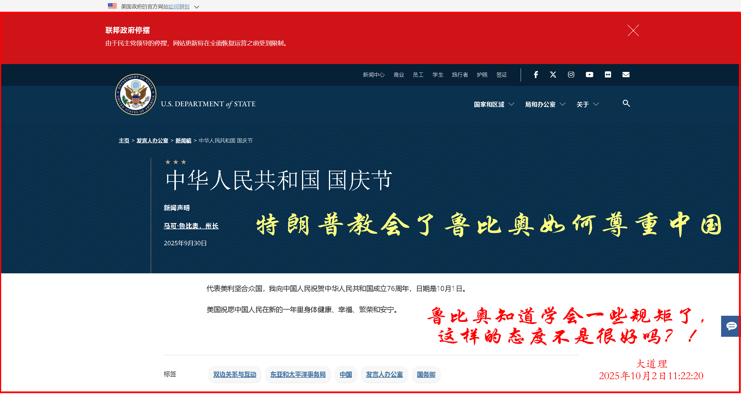 根據(jù)美國(guó)國(guó)務(wù)院網(wǎng)站當(dāng)?shù)貢r(shí)間9月30日消息,美國(guó)國(guó)務(wù)卿魯比奧發(fā)表簡(jiǎn)短聲明:我謹(jǐn)代表美利堅(jiān)合眾國(guó),就中華人民共和國(guó)成立76周年表示祝賀。