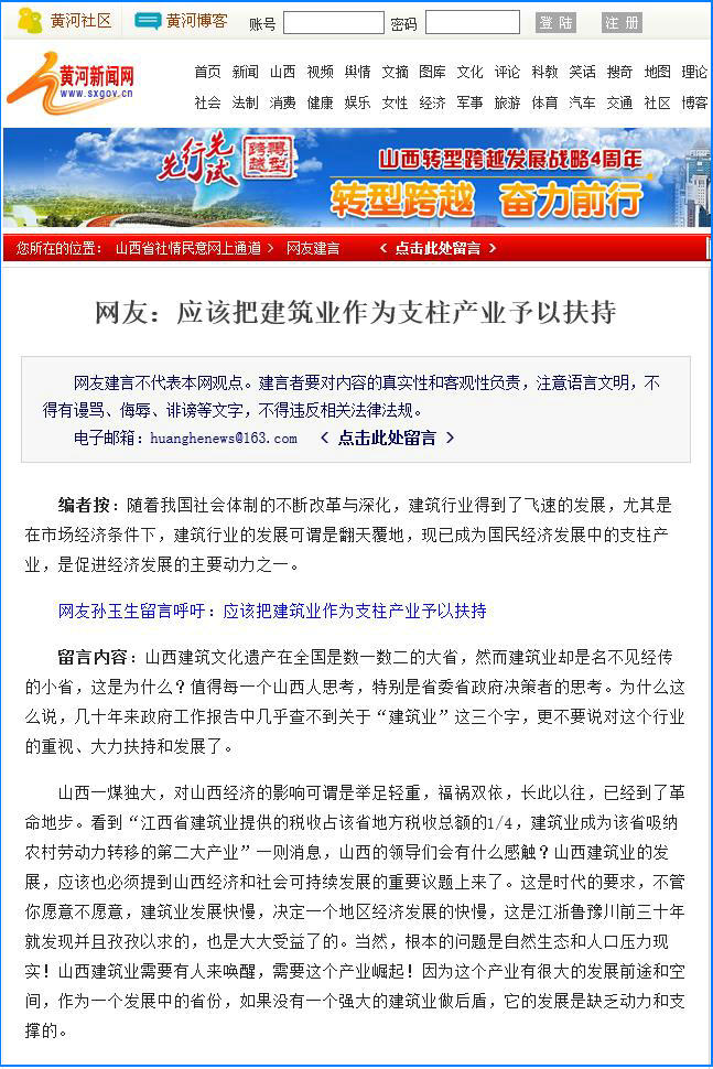 留言內(nèi)容:山西建筑文化遺產(chǎn)在全國是數(shù)一數(shù)二的大省,然而建筑業(yè)卻是名不見經(jīng)傳的小省,這是為什么?值得每一個(gè)山西人思考,特別是省委省政府決策者的思考。為什么這么說,幾十年來政府工作報(bào)告中幾乎查不到關(guān)于“建筑業(yè)”這三個(gè)字,更不要說對這個(gè)行業(yè)的重視、支持、大力扶持和發(fā)展了。山西一煤獨(dú)大,對山西經(jīng)濟(jì)的影響可謂是舉足輕重,福禍雙依,長此以往,已經(jīng)到了革命地步??吹健敖魇〗ㄖI(yè)提供的稅收占該省地方稅收總額的1/4,建筑業(yè)成為該省吸納農(nóng)村勞動(dòng)力轉(zhuǎn)移的第二大產(chǎn)業(yè)”一則消息,山西的領(lǐng)導(dǎo)們會(huì)有什么感觸?山西建筑業(yè)的發(fā)展,應(yīng)該也必須提到山西經(jīng)濟(jì)和社會(huì)可持續(xù)發(fā)展的重要議題上來了,這是時(shí)代的要求,不管你愿意不愿意,建筑業(yè)發(fā)展快慢,決定一個(gè)地區(qū)經(jīng)濟(jì)發(fā)展的快慢,這是江浙魯豫川前三十年就發(fā)現(xiàn)并且孜孜以求的,也是大大受益了的。當(dāng)然,根本的問題是自然生態(tài)和人口壓力逼迫的!山西建筑業(yè)需要有人來喚醒,需要這個(gè)產(chǎn)業(yè)崛起!因?yàn)檫@個(gè)產(chǎn)業(yè)有很大的發(fā)展前途和空間,作為一個(gè)發(fā)展中的省份,如果沒有一個(gè)強(qiáng)大的建筑業(yè)做后盾,她的發(fā)展是缺乏動(dòng)力和支撐的。
