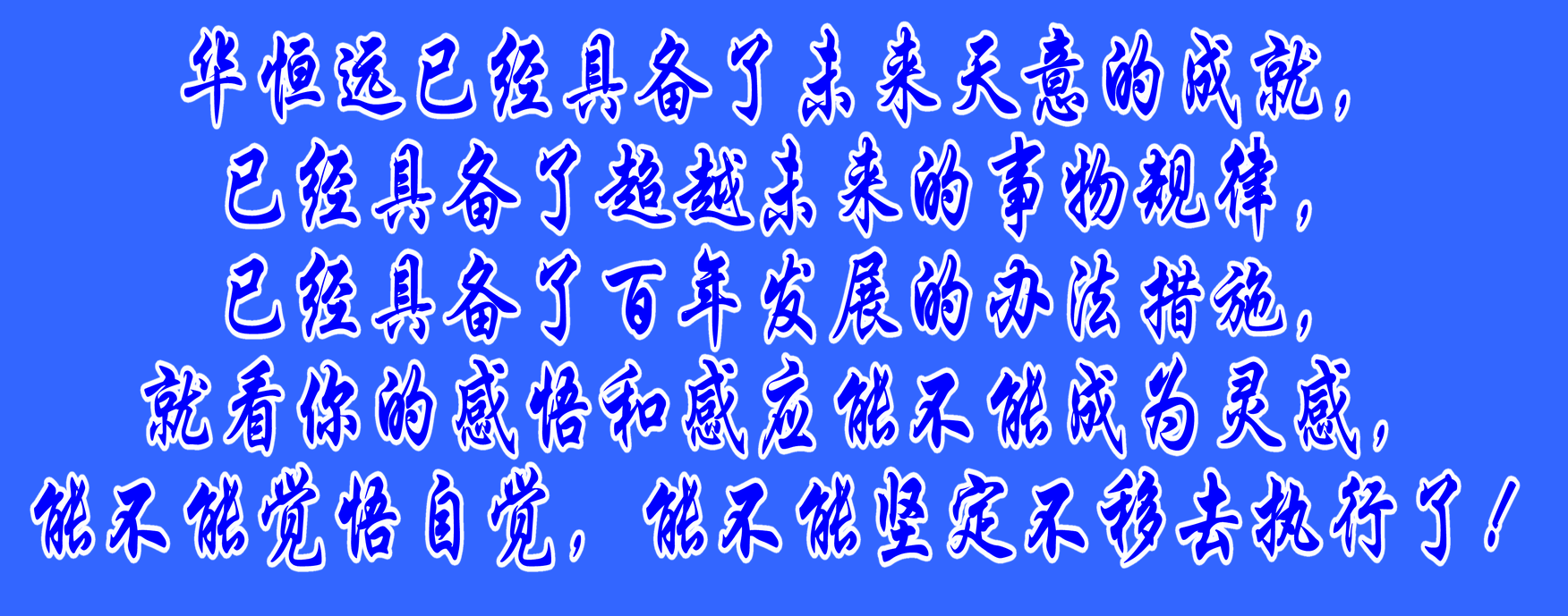 華恒遠(yuǎn)已經(jīng)具備了未來天意的成就,已經(jīng)具備了超越未來的事物規(guī)律,已經(jīng)具備了百年發(fā)展的辦法措施,就看你的感悟和感應(yīng)能不能成為靈感,能不能覺悟自覺,能不能堅定不移去執(zhí)行了!